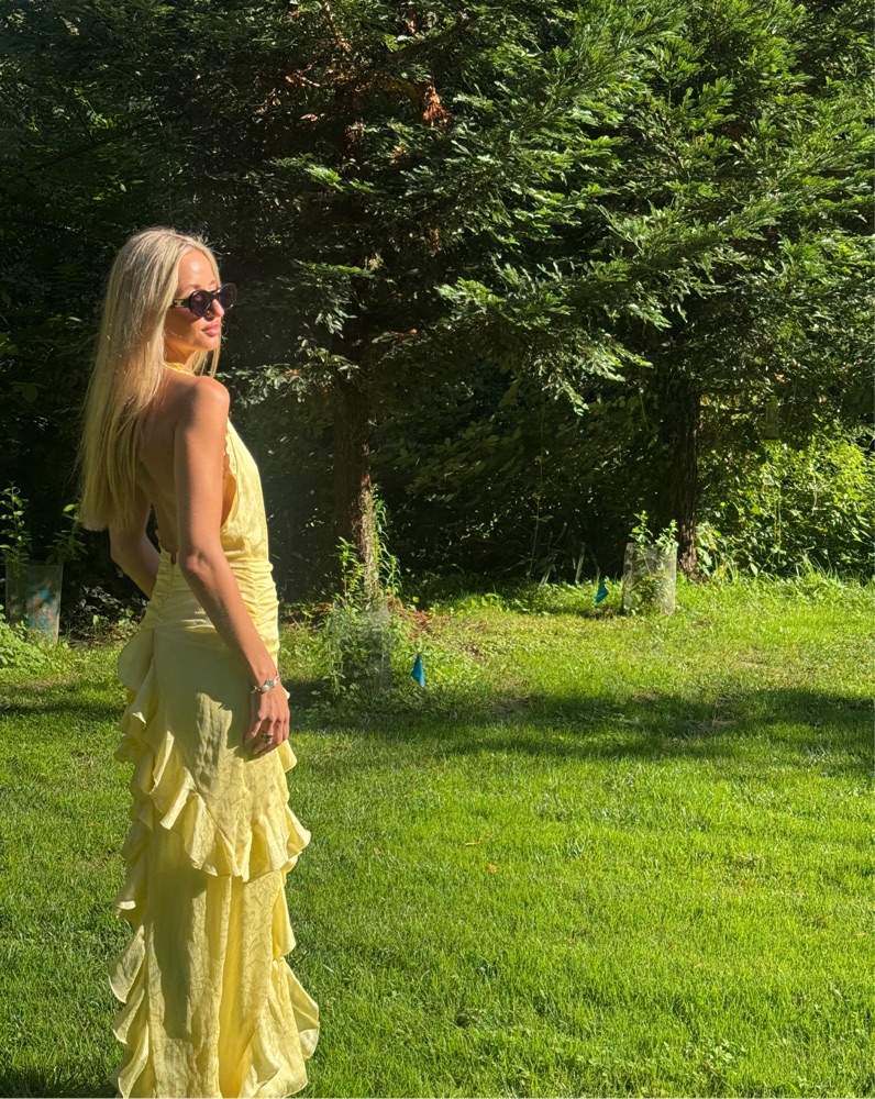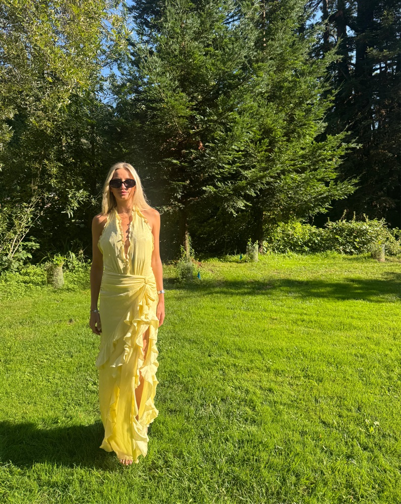 This stunning maxi dress in a vibrant yellow hue is perfect for a summer garden party or elegant outdoor event. The flowing ruffled skirt and halter neckline create a romantic and feminine silhouette.