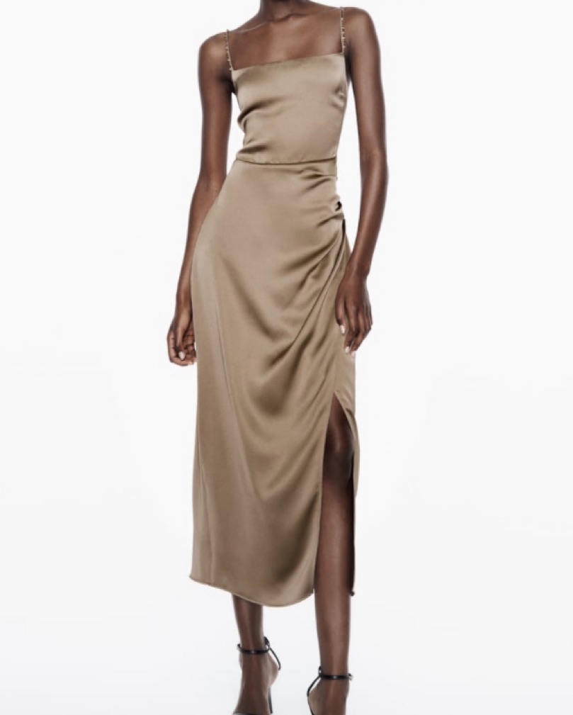 Midi Satin Dress with Rhinestone Straps! Perfect for a classy event and night out. I wore it to NYFW!