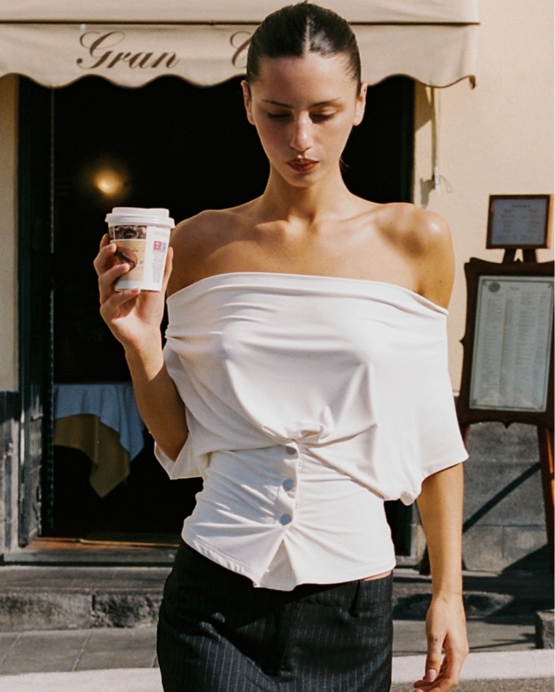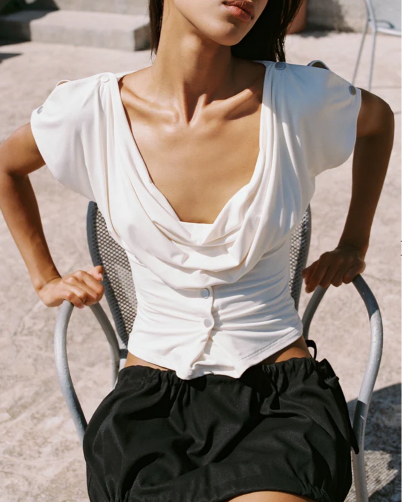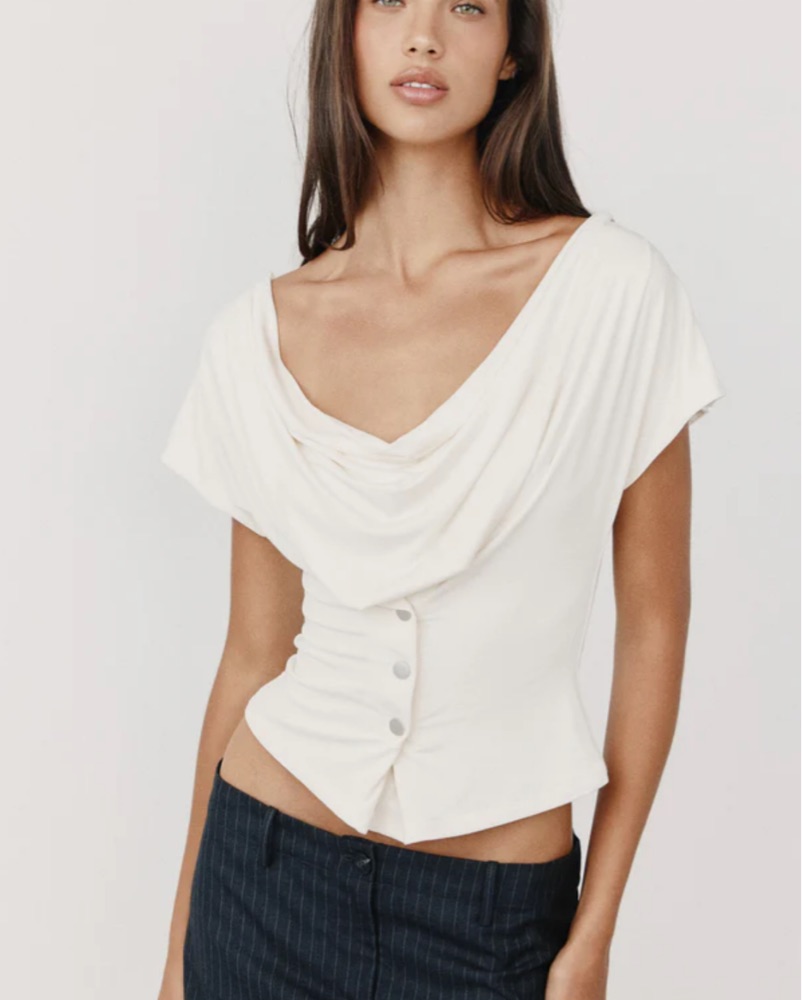 Adorable top from with WithJean!! Online description: The Sienna Top is a fitted, cowl neck top featuring button-up cap sleeves and a button-up front closure. Tags: birthday, dinner, date night, going out, bridal, vacation, etc
