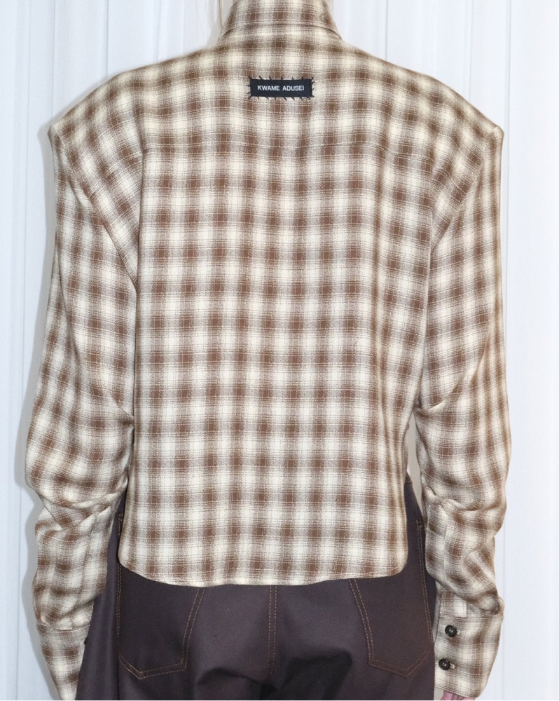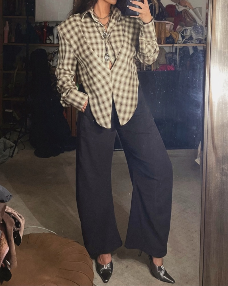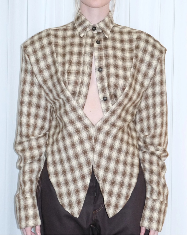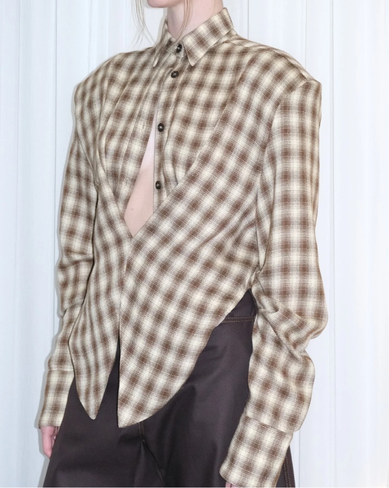 An oversized, slouchy silhouette with a draped, plunge neckline. KAFRA is the perfect elevated button-up alternative, tied together with an exaggerated shoulder. Angled hem and cropped sides.