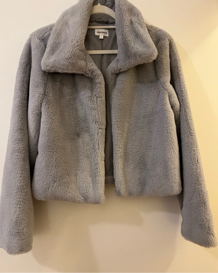 Must dry clean prior to returning & return with dry clean slip. Color is grey with hues of lavender. Perfect for a wedding or occasion or to dress your look up on a cold night out.