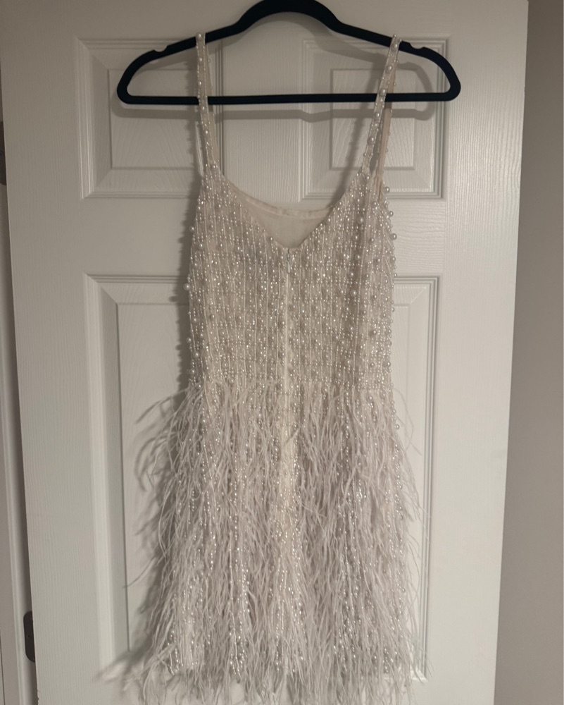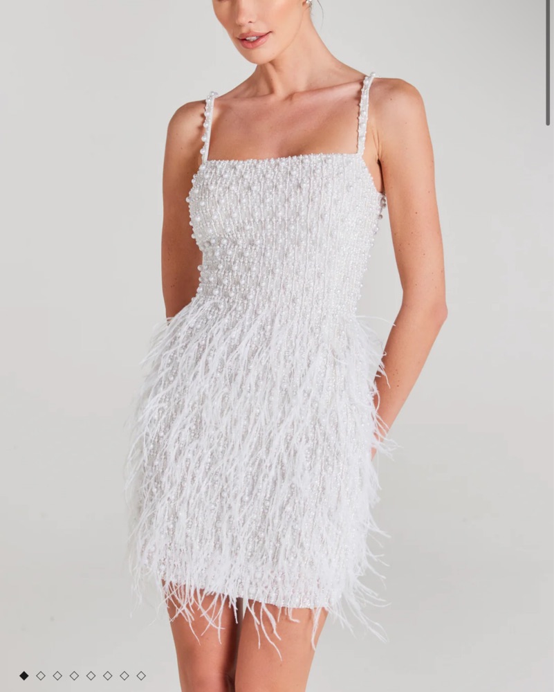 This glam feather dress is perfect for a night out or special occasion. The striking silver sequins and soft feathers create a glamorous and eye-catching look.