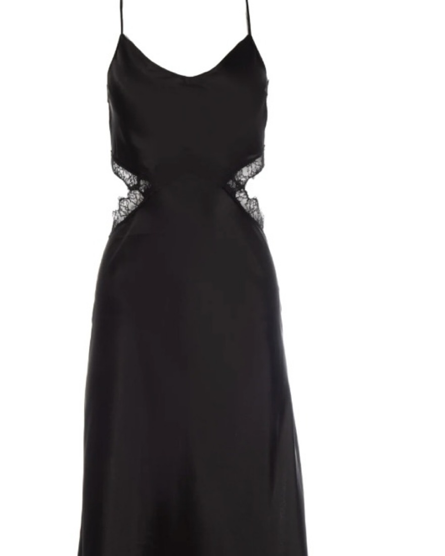 Long black silk dress w slit and lace detail / cut out on each side. Price includes dry cleaning