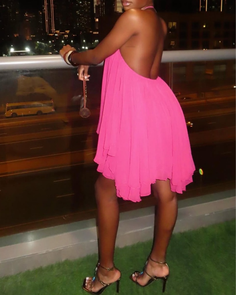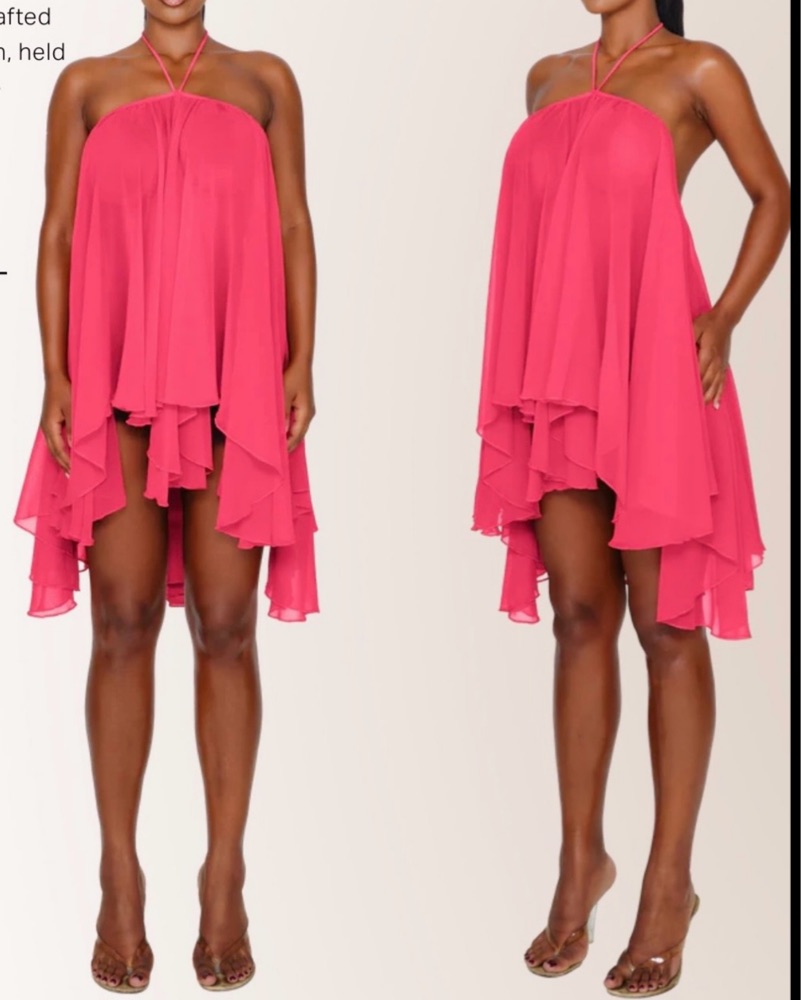 This stunning halter dress features a vibrant pink hue and a cascading ruffle skirt, perfect for a night out or special event.