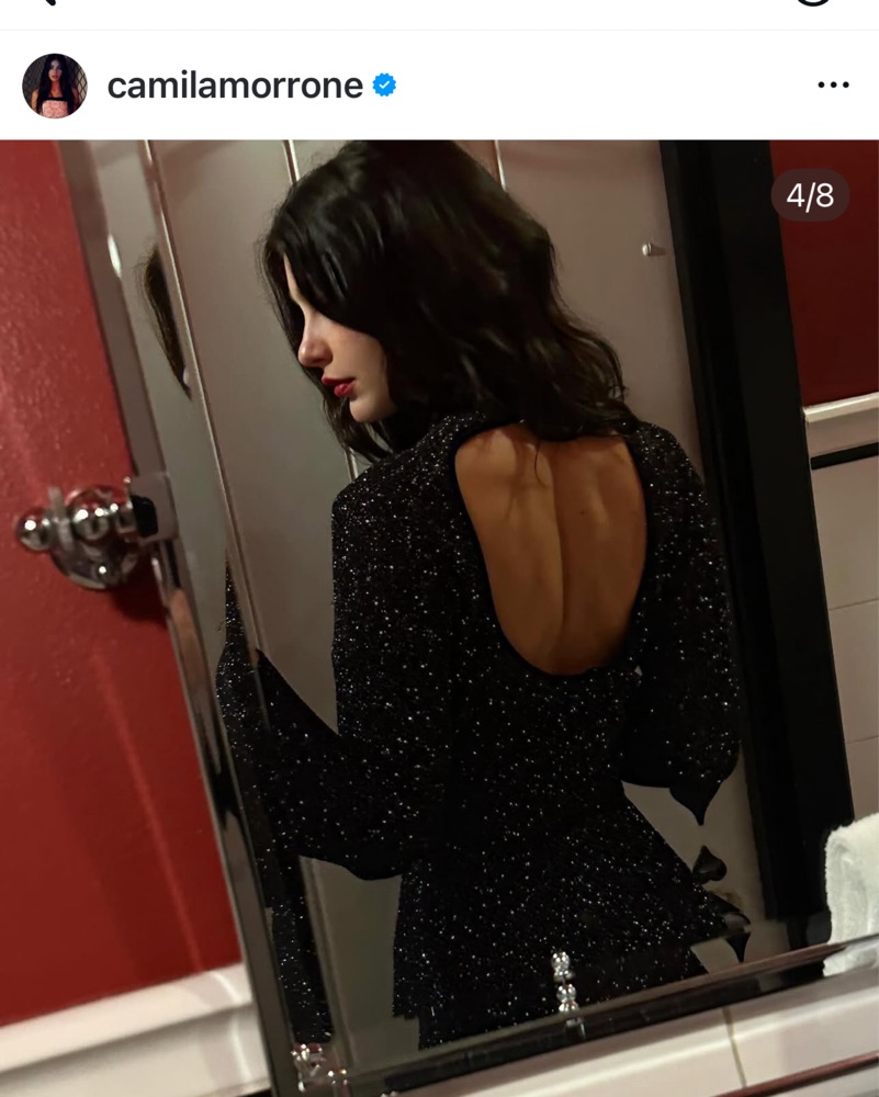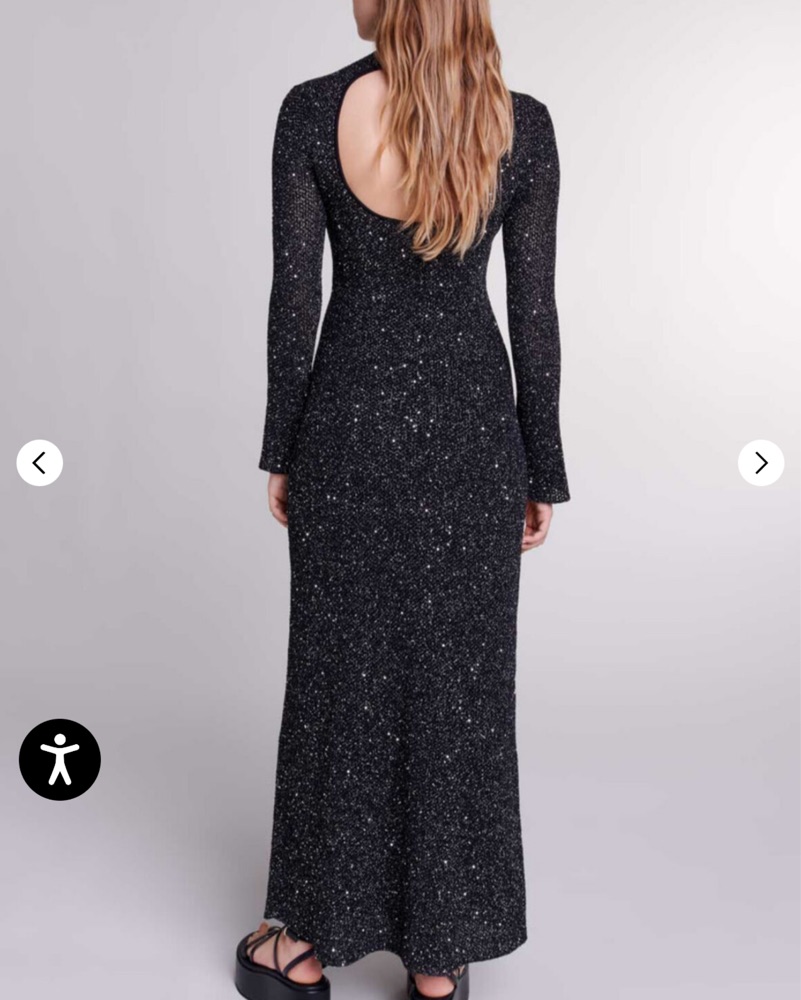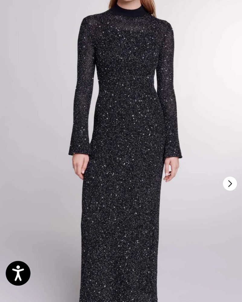 Sleek black Maje maxi dress with allover subtle sparkle and a refined high neckline. Fitted, flattering, and effortlessly elegant—perfect for holiday parties, winter weddings, or New Year’s Eve. As seen on Camilla Morrone