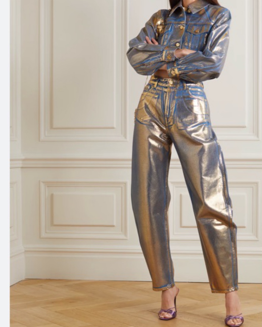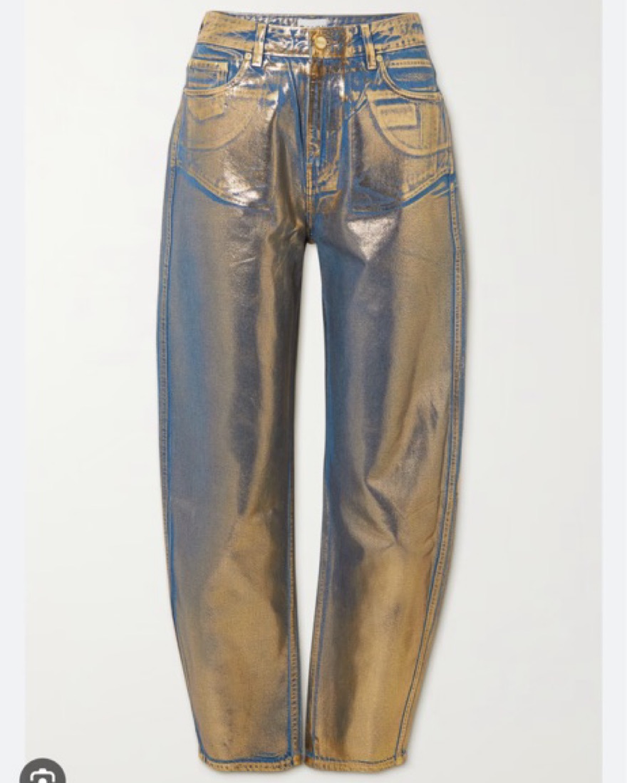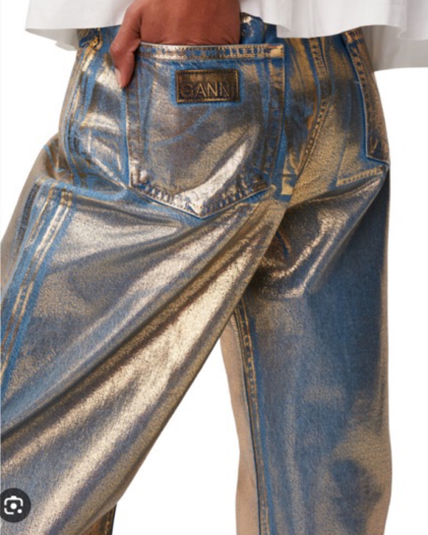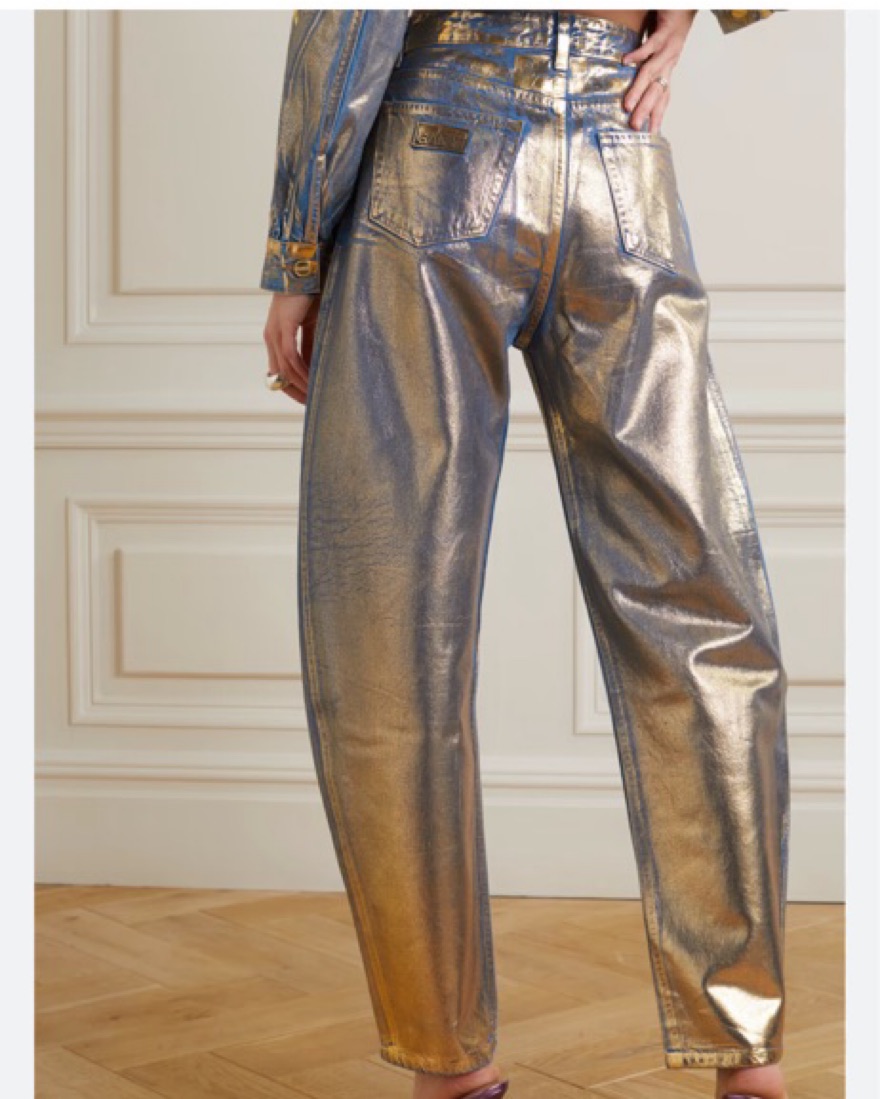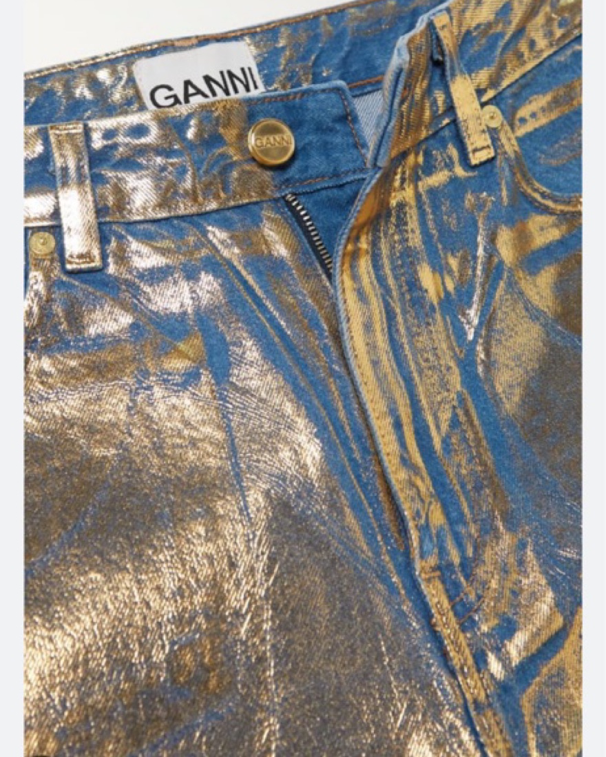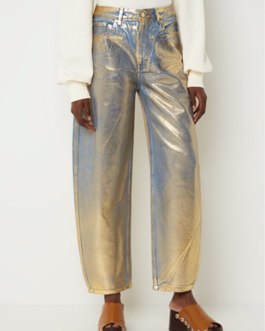 Stary’ jeans from GANNI are covered in a gold metallic coating, adding a lustrous sheen. They’re cut from organic cotton with a high-rise waist, which leads to a slightly oversized tapered leg. Wear yours with a plain tee or amp up the glamour with the matching jacket.