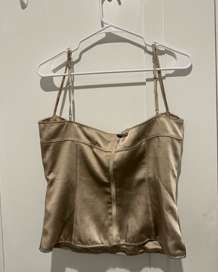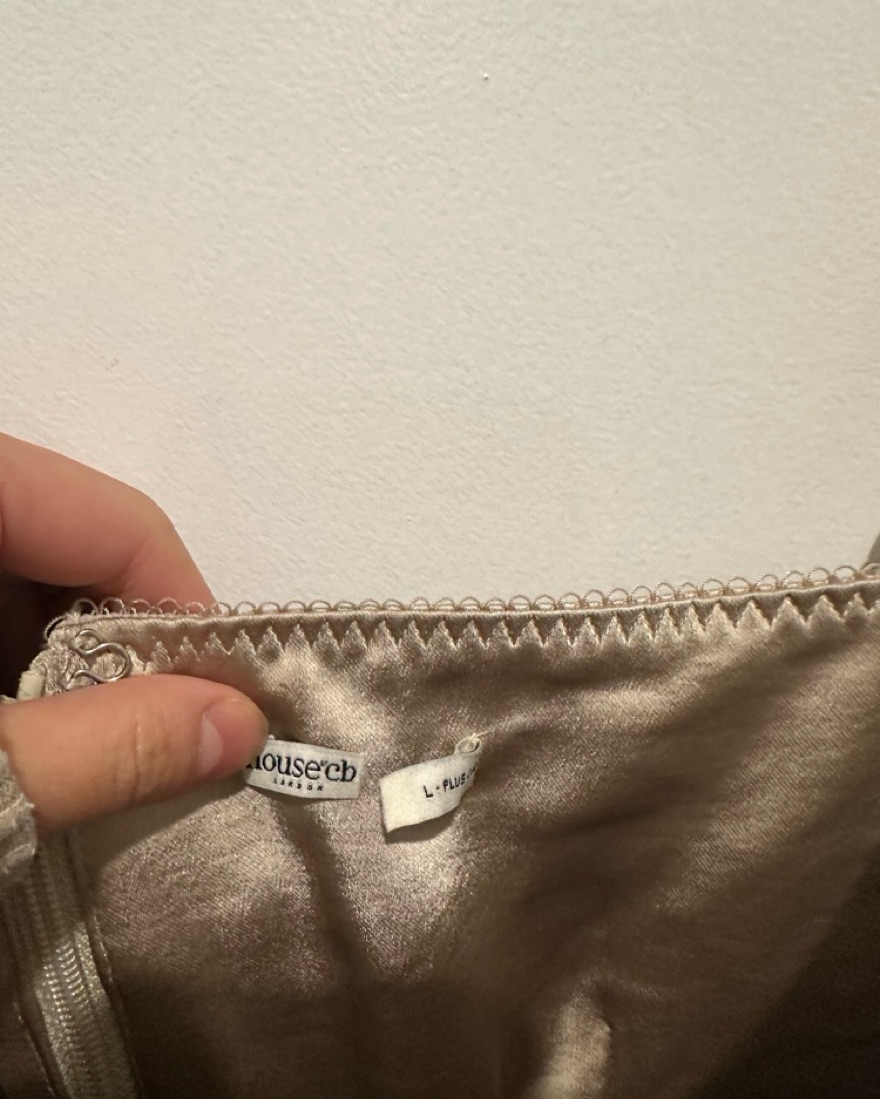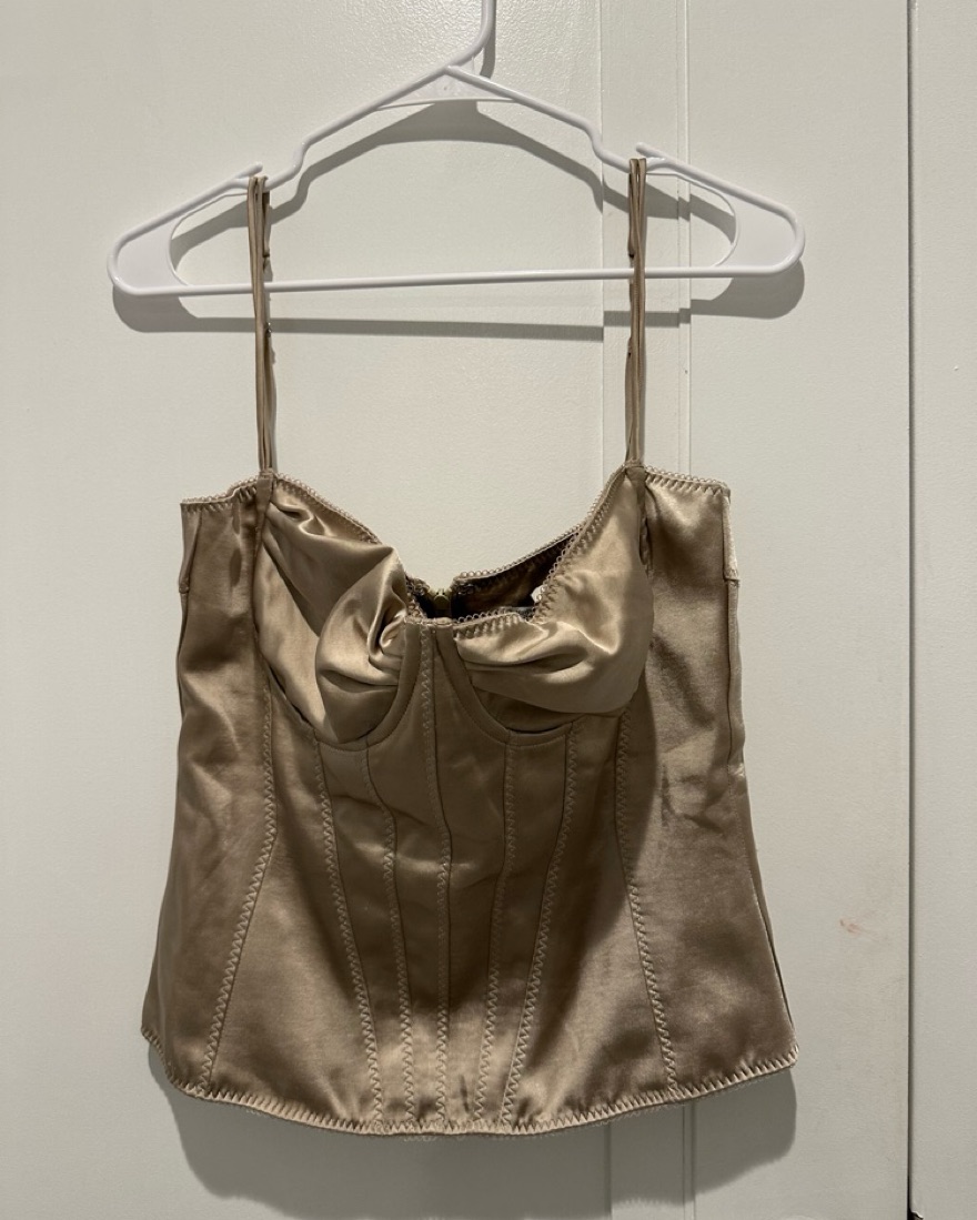 House Of CB Chantal Champagne Satin Top, Large Plus Cup.'Chantal' is our soft and delicate bustier top, cut from luxurious sheen satin blended with stretch in a champagne hue. The soft gathered cups offer support and shape, framed by slender adjustable straps and 'Chantal' is designed with decorativ