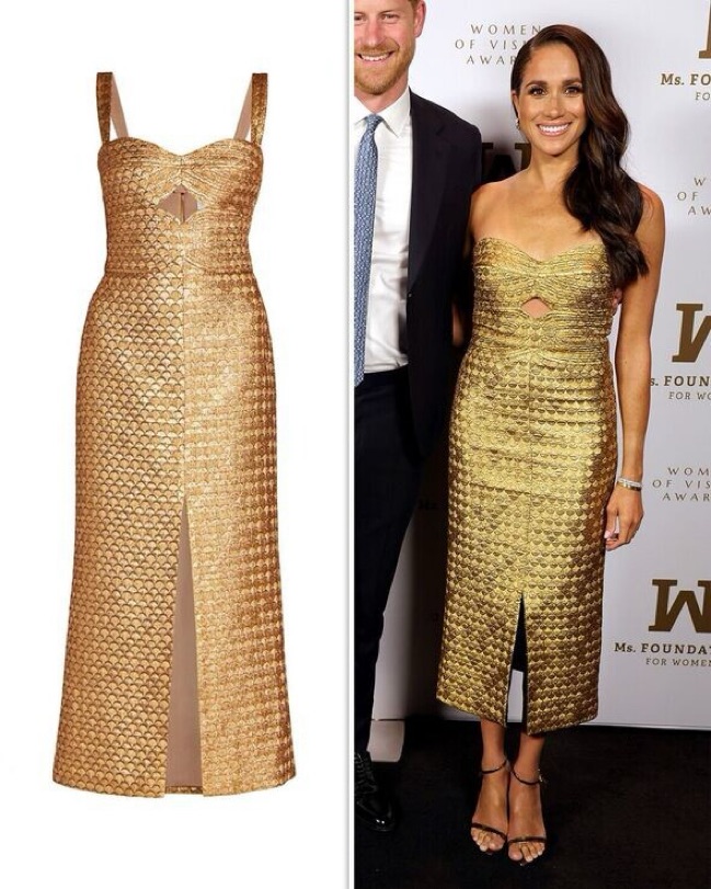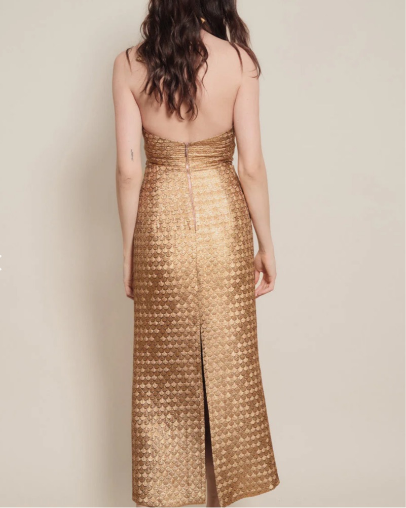 Johanna Ortiz Gold Elegant Expedition Halter Dress. Even more Stunning In person and similar to the style that Megan Markle wore.