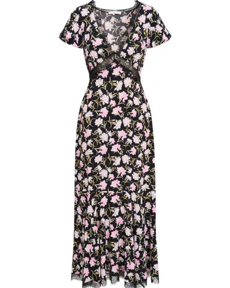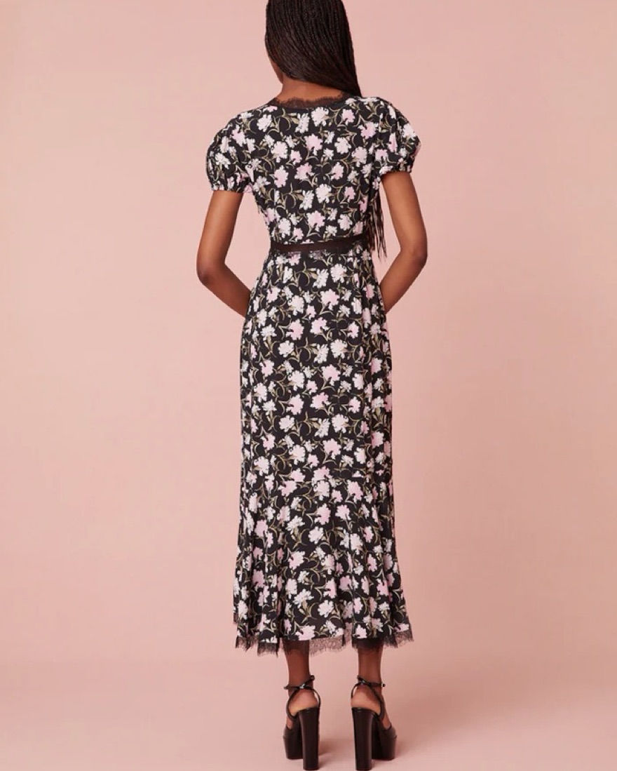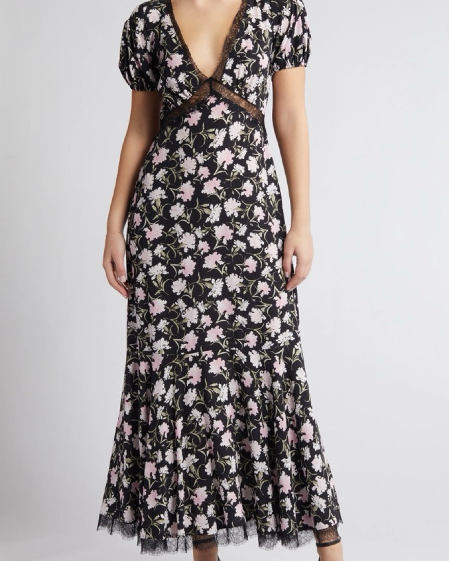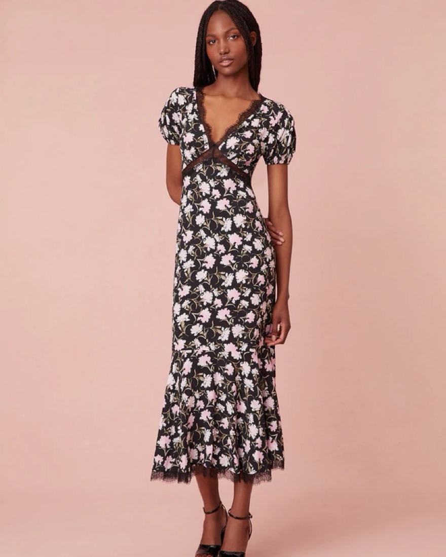 The perfect fall dress for weddings, engagement parties and cocktail events! Black and floral pattern with laced detailing throughout the dress.