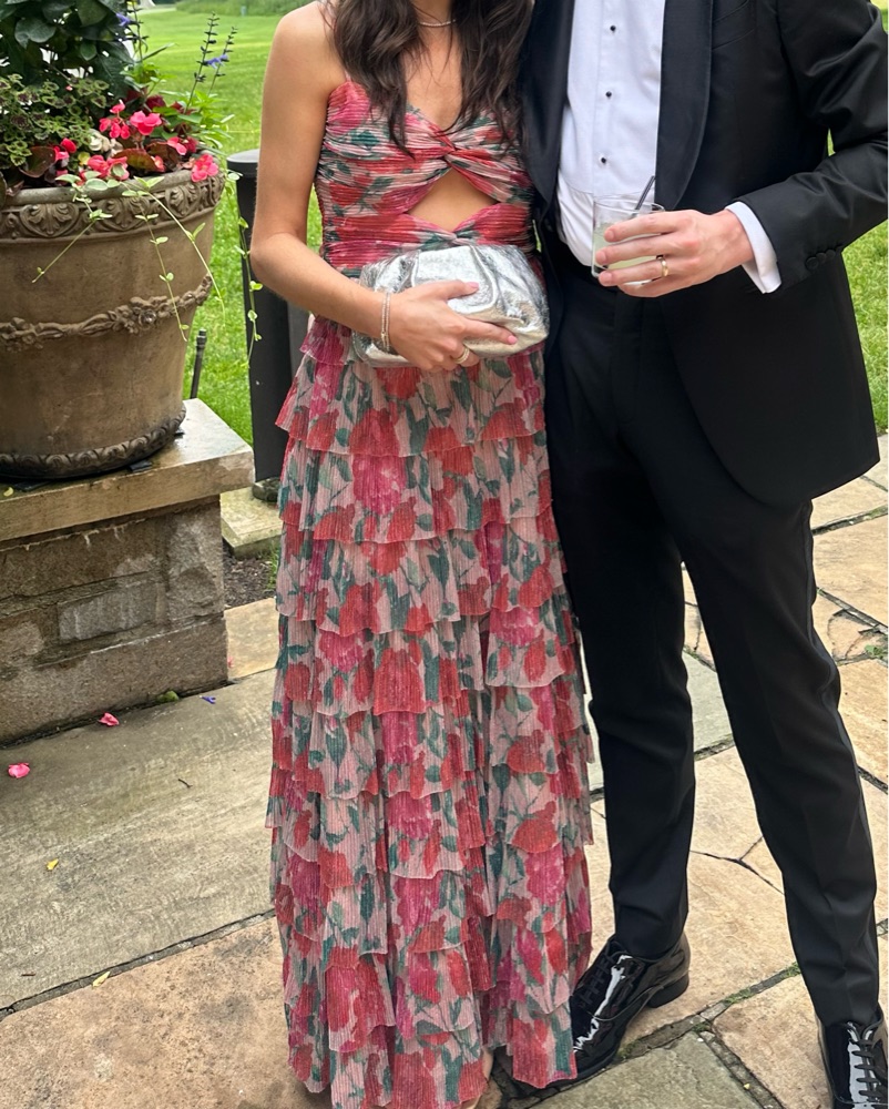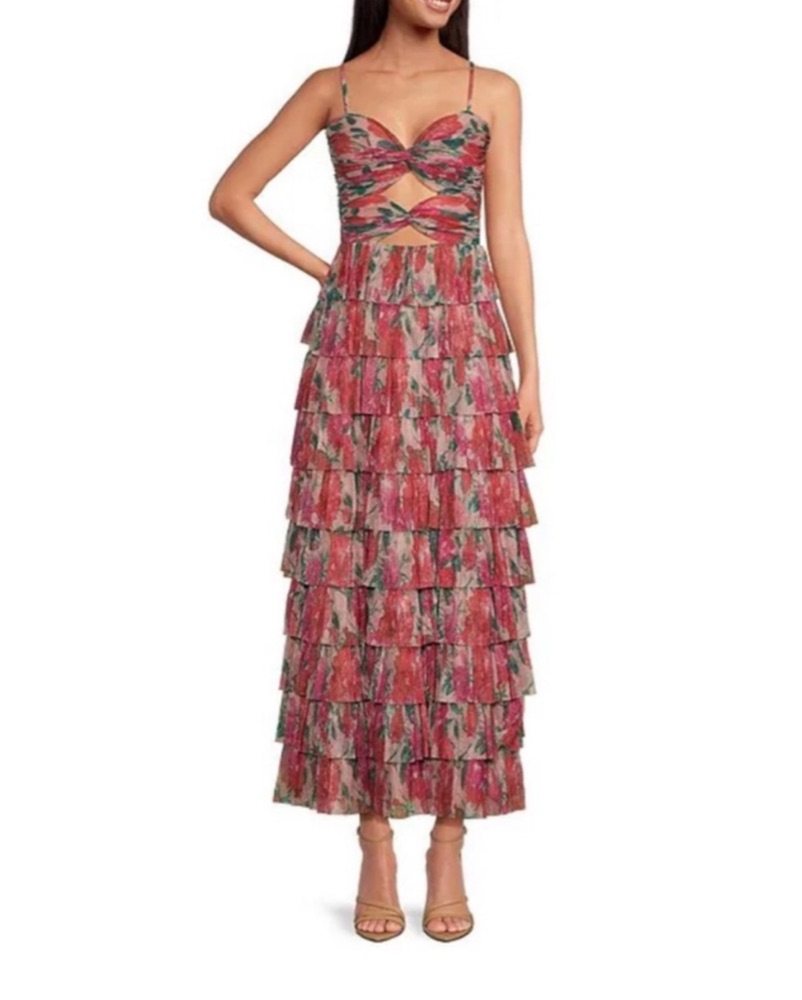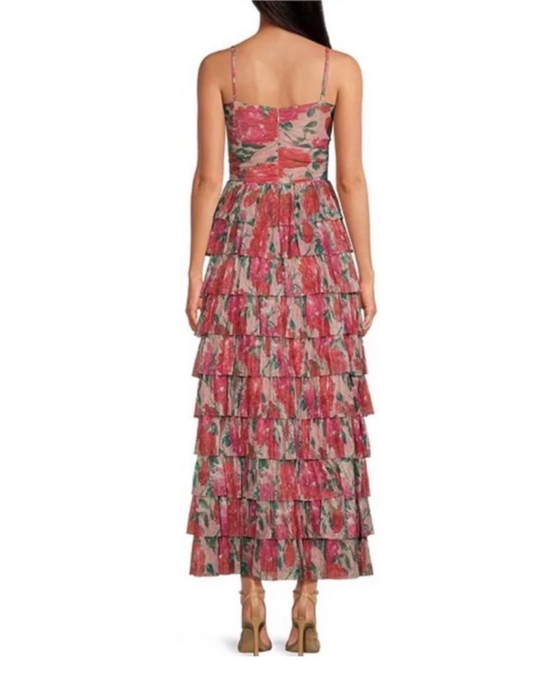 Gianni Bini Grace Plisse Floral Print Sweetheart Neck Cut-Out Tiered Dress (A-line) Sweetheart neckline Spaghetti straps Zip back closure Approx. 48" length