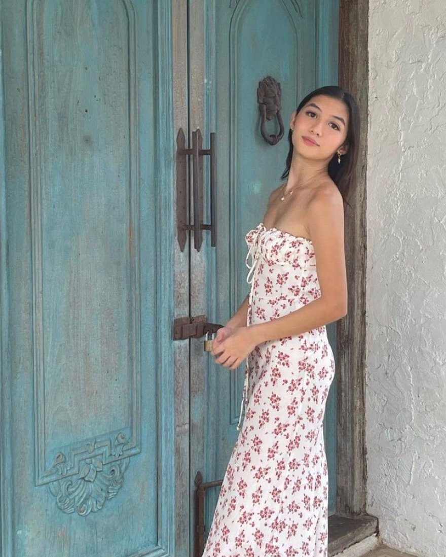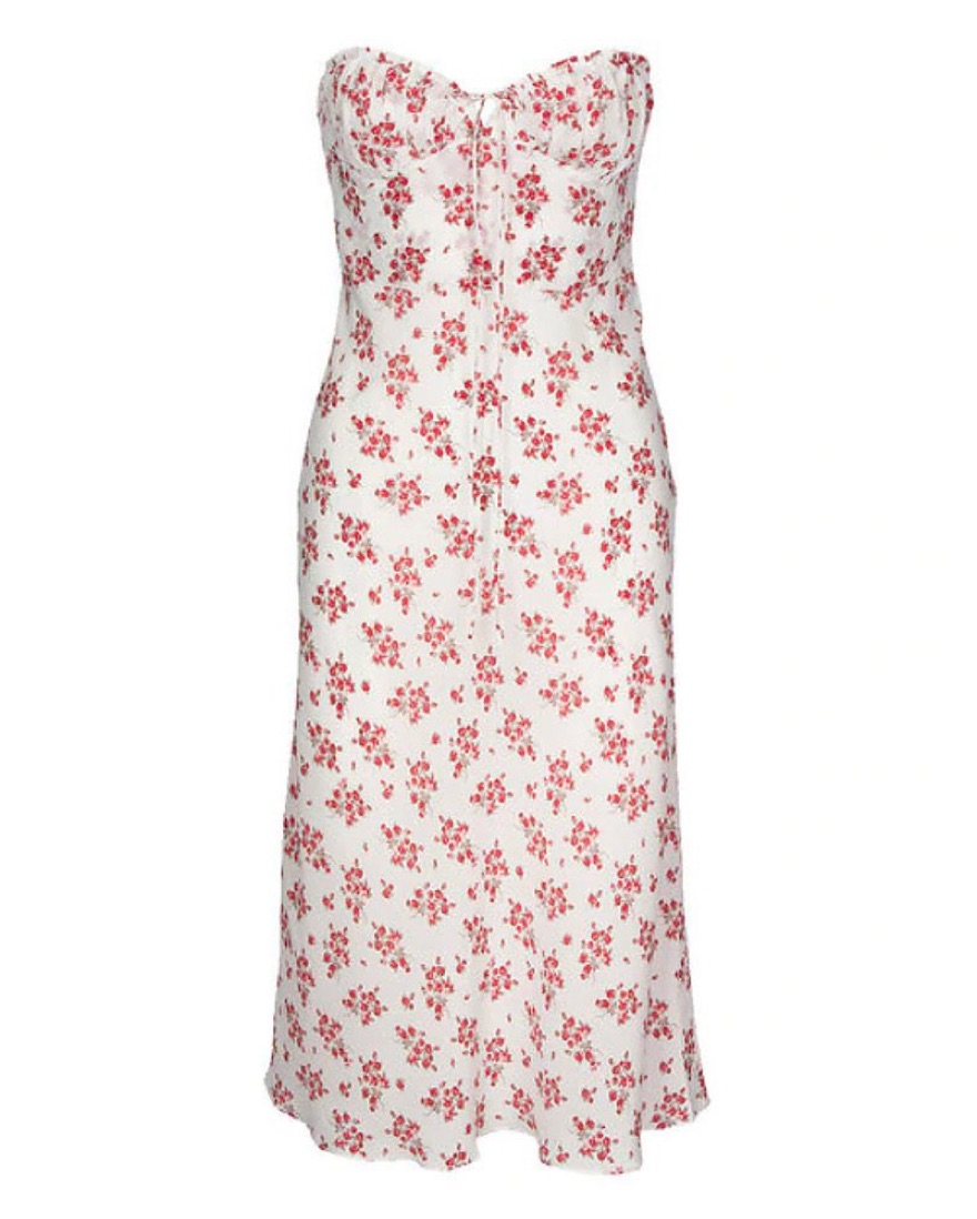 This item is in perfect condition! Highlights from RP: Midi length bustier dress, Removable and adjustable grosgrain straps, can be worn with straps or strapless, Adjustable tie front bust, Cupped bust with pleat detail. 100% silk crepe de chine. Super flattering and perfect for summer!