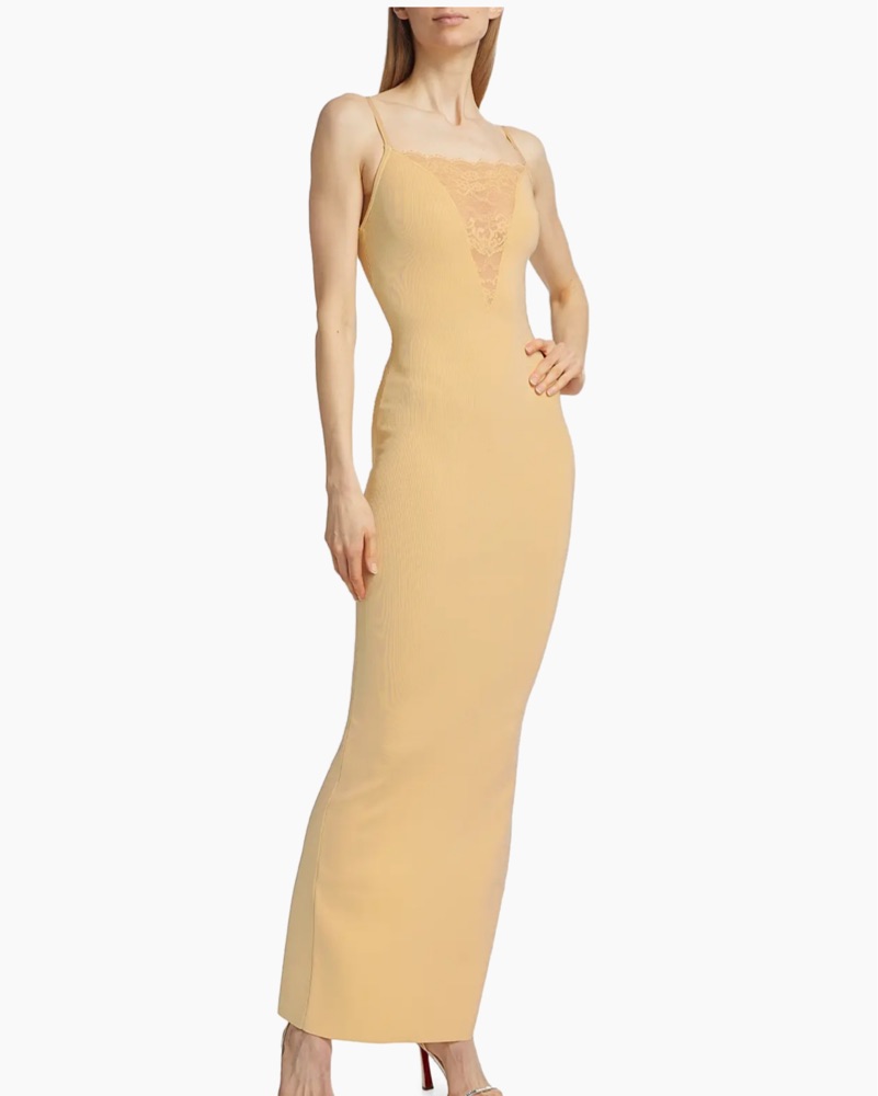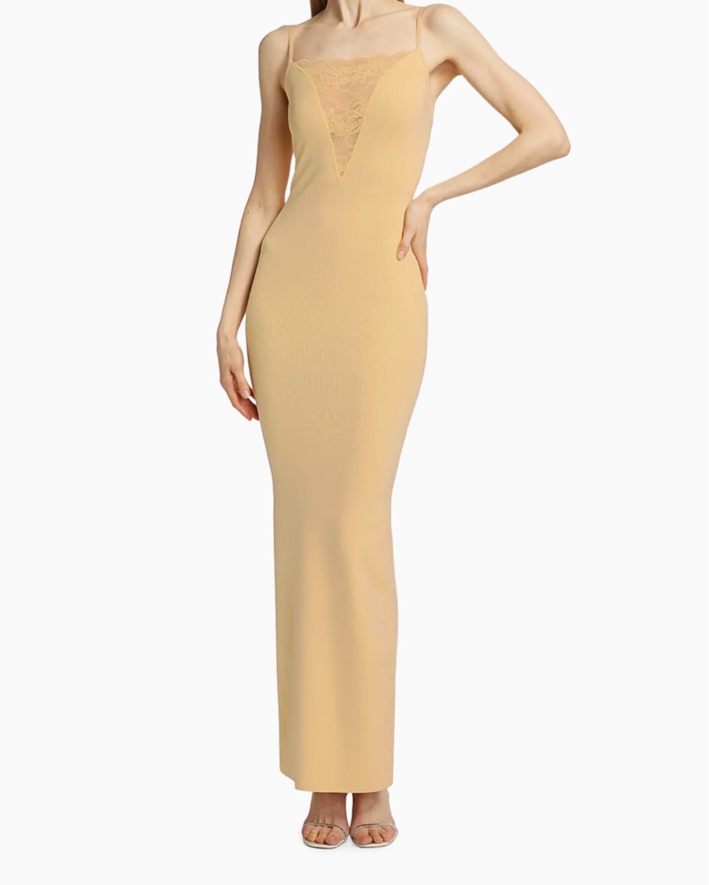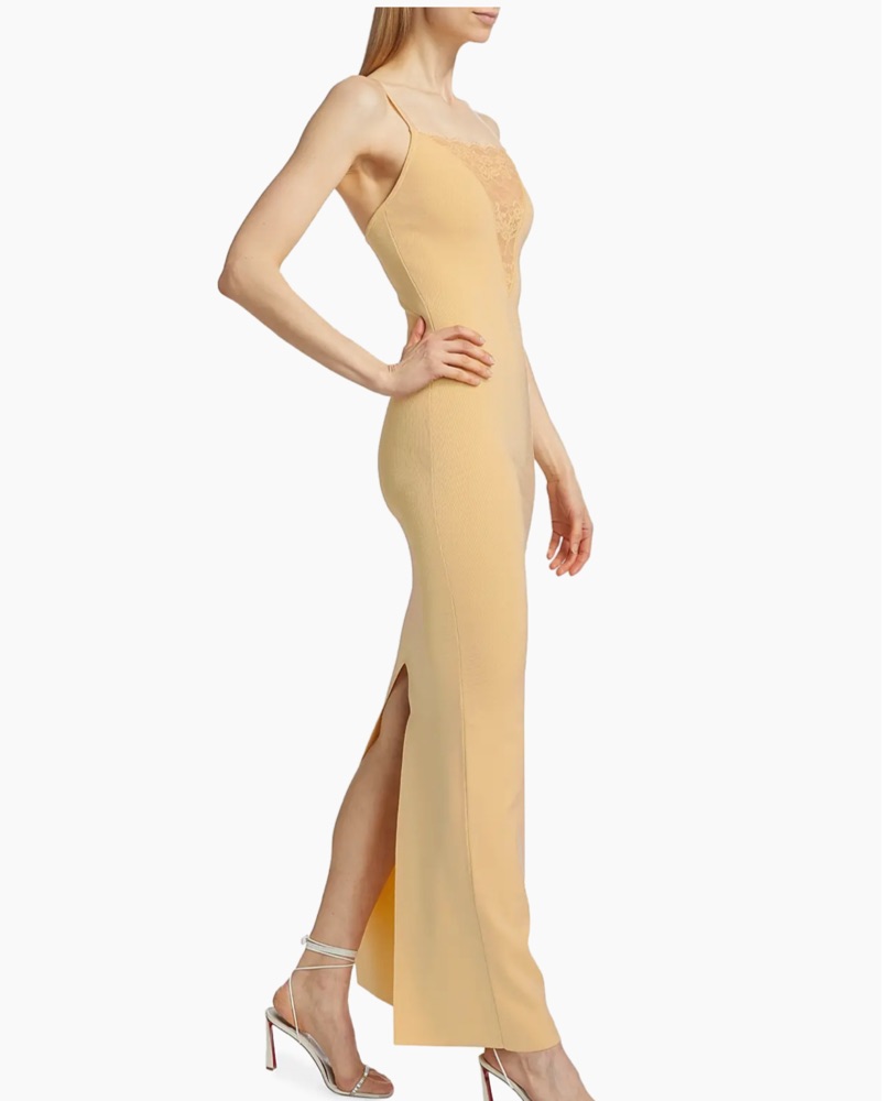 Crafted of a fine knit, Ronny Kobo's Jenae sleeveless maxi dress features a bandeau neck, back slit, and lace trim.