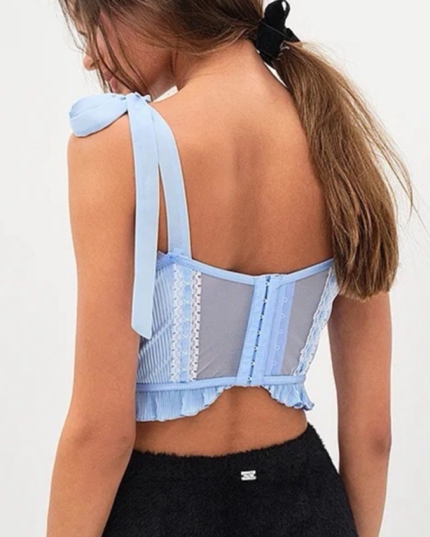 Stunning baby blue bow ties adorn the faux corset bustier.