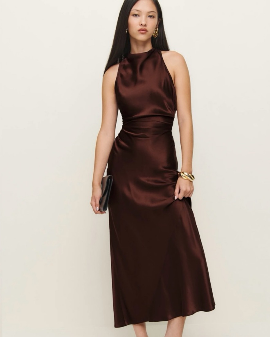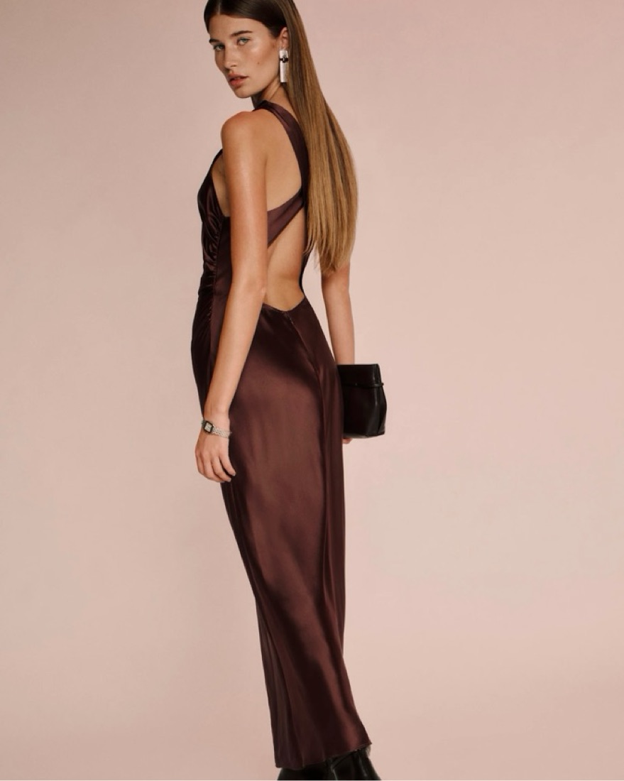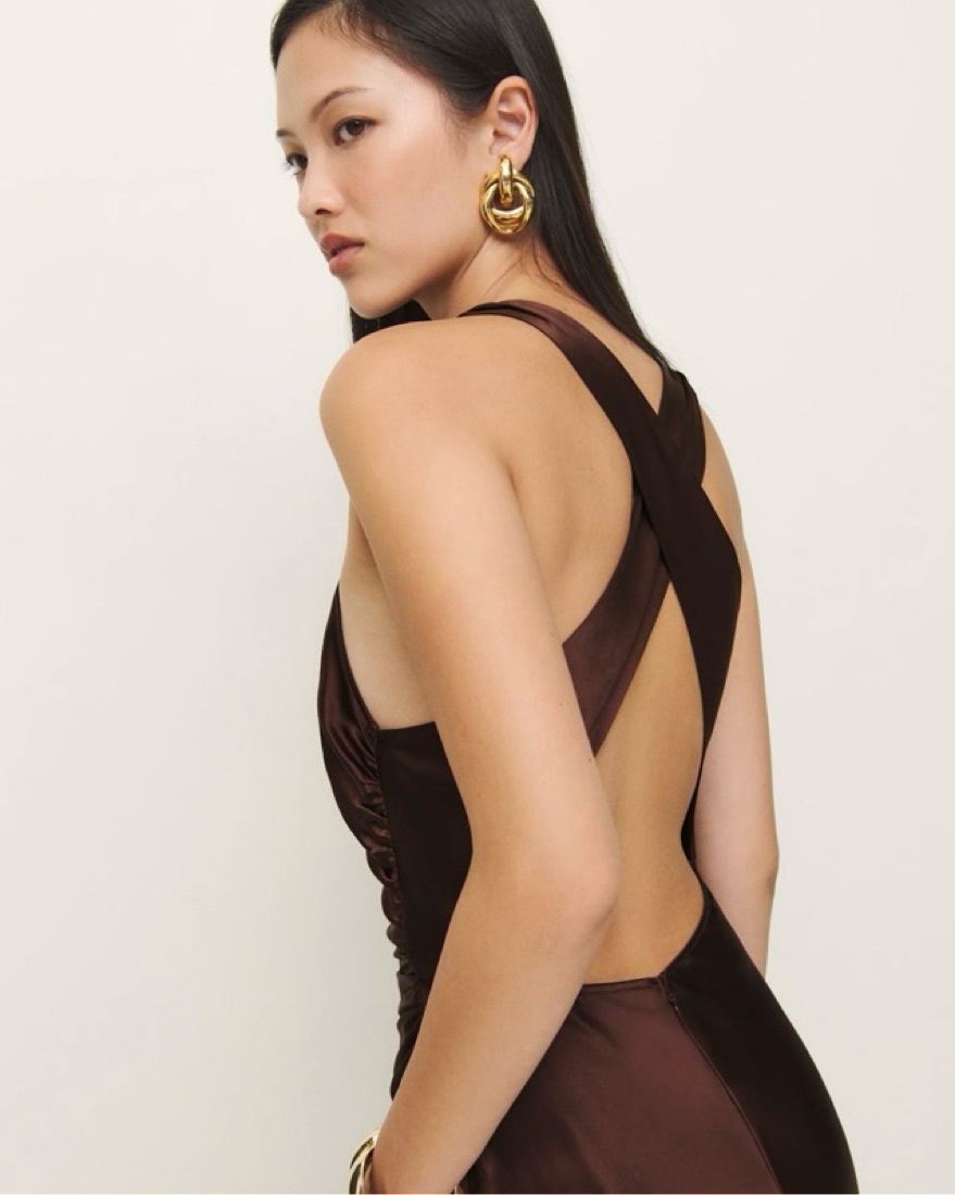Reformation Casette silk dress in mahogany. Such a stunning gown & love the open back. Perfect for an event or wedding. Fits like a size small. 100% silk.