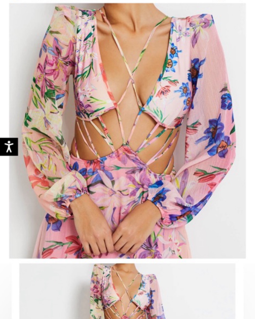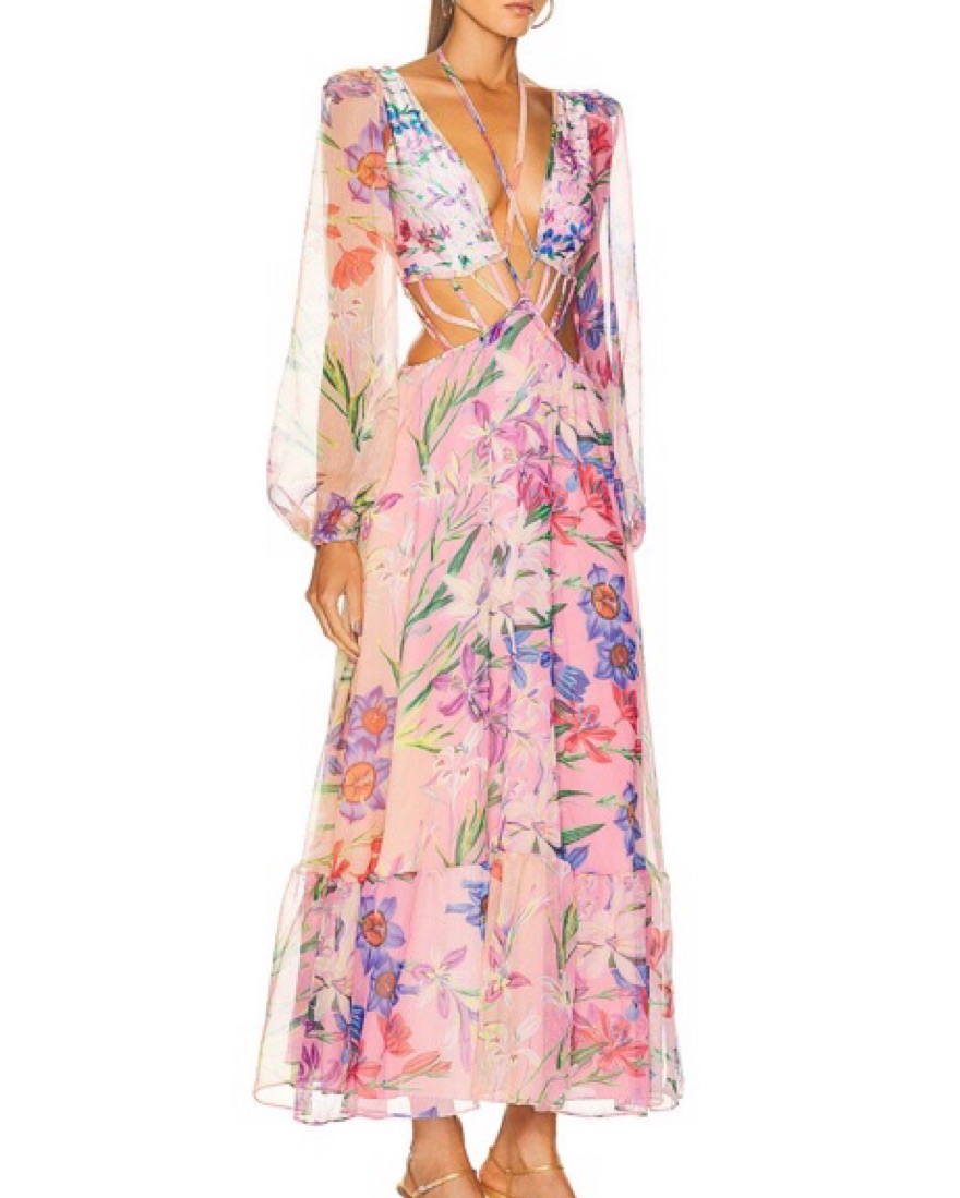 This stunning maxi dress is perfect for a spring or summer event. The bold floral print and dramatic cutout details make it a head-turning choice.