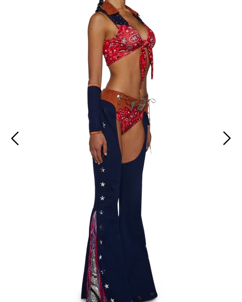 This bold and playful bandana print bikini is perfect for a fun day at the beach or pool. The top's tie-front detail adds a flirty touch.