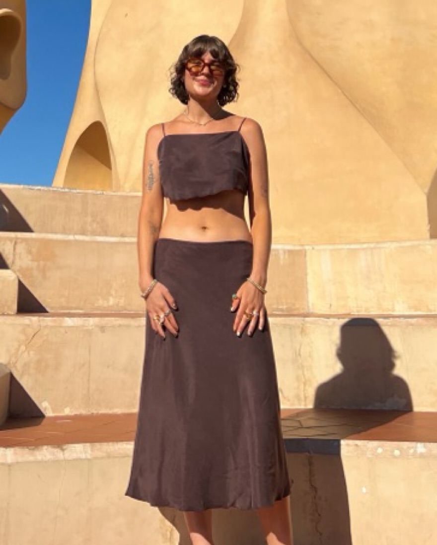 Dream Dress turned into Dream Set! The silky cupro fabric has a wonderful touch with a peachy surface and feels like a warm hug against the body. Just like the dress, this set has thin spaghetti straps and ties in the back to adjust the width and length of the shoulder straps.