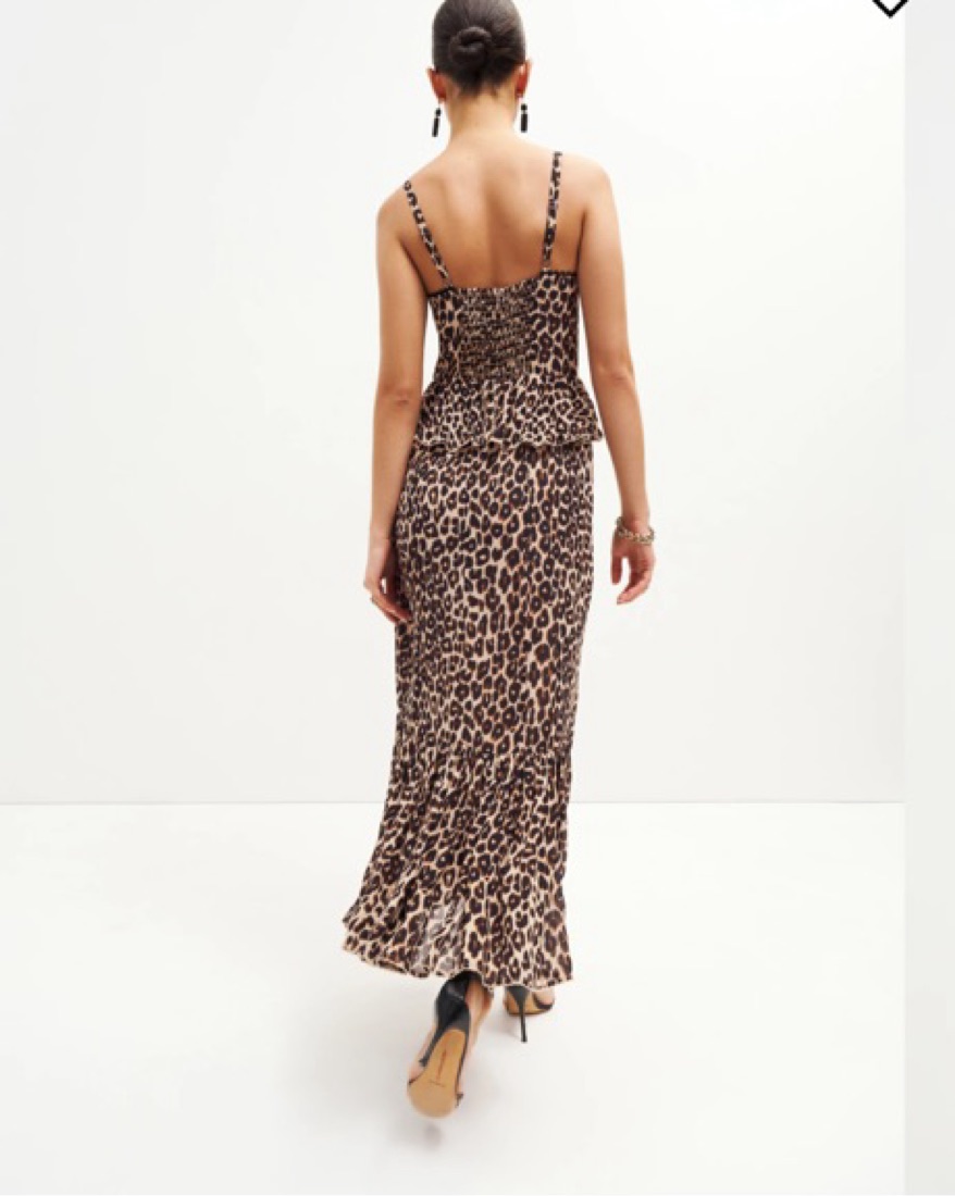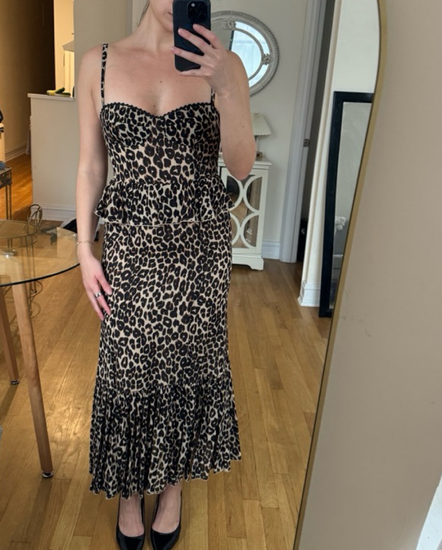 This stunning Reformation leopard print maxi dress is perfect for a night out on the town. The figure-flattering silhouette and vibrant print will turn heads wherever you go. Fits well, has alittle give. I have been a 2 and a 4 and it fits me at both sizes