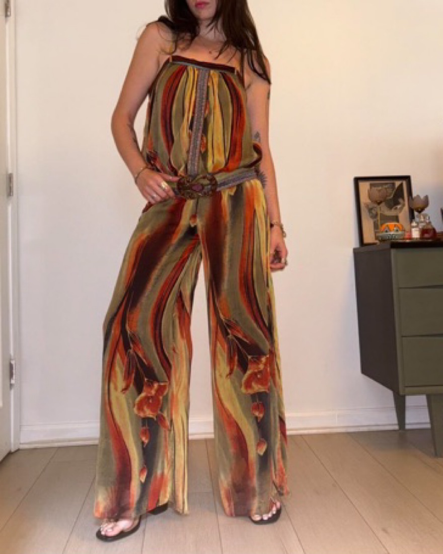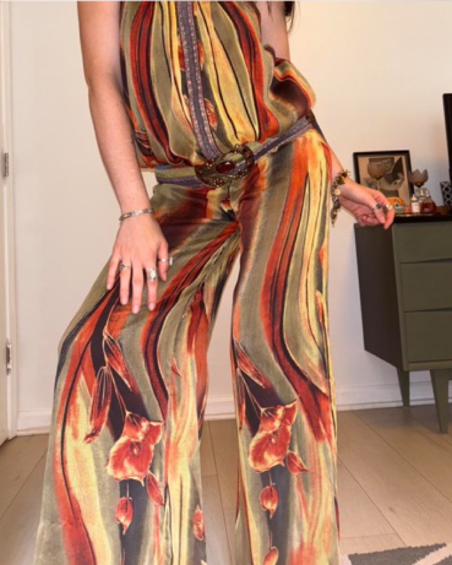 Vintage wide leg jumpsuit! Circa early 2000s, this flowy sheer jumpsuit is lined with a super soft n stretchy brown material, and has the cutest purple rhinestone belt and super cute green velvet ribbon detail. Low rise wide leg fit, best for a bigger small or smaller medium!