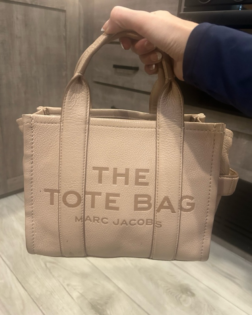 This leather tote bag from Marc Jacobs is perfect for everyday use. Its roomy interior and chic design make it a stylish and functional accessory. Comes with long, thick printed strap that matches tanish/light pink leather.