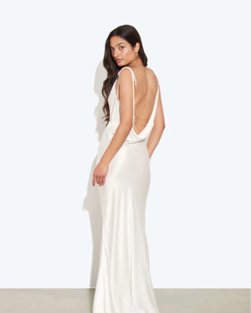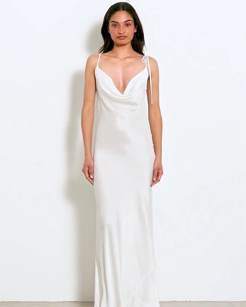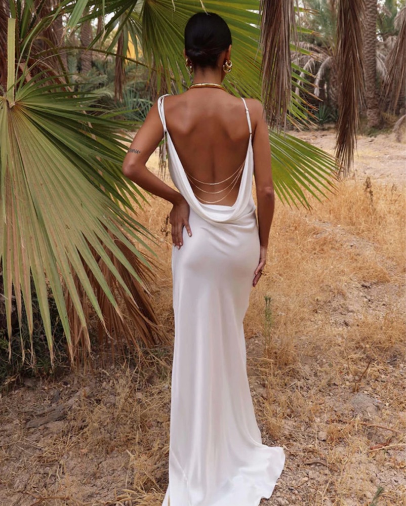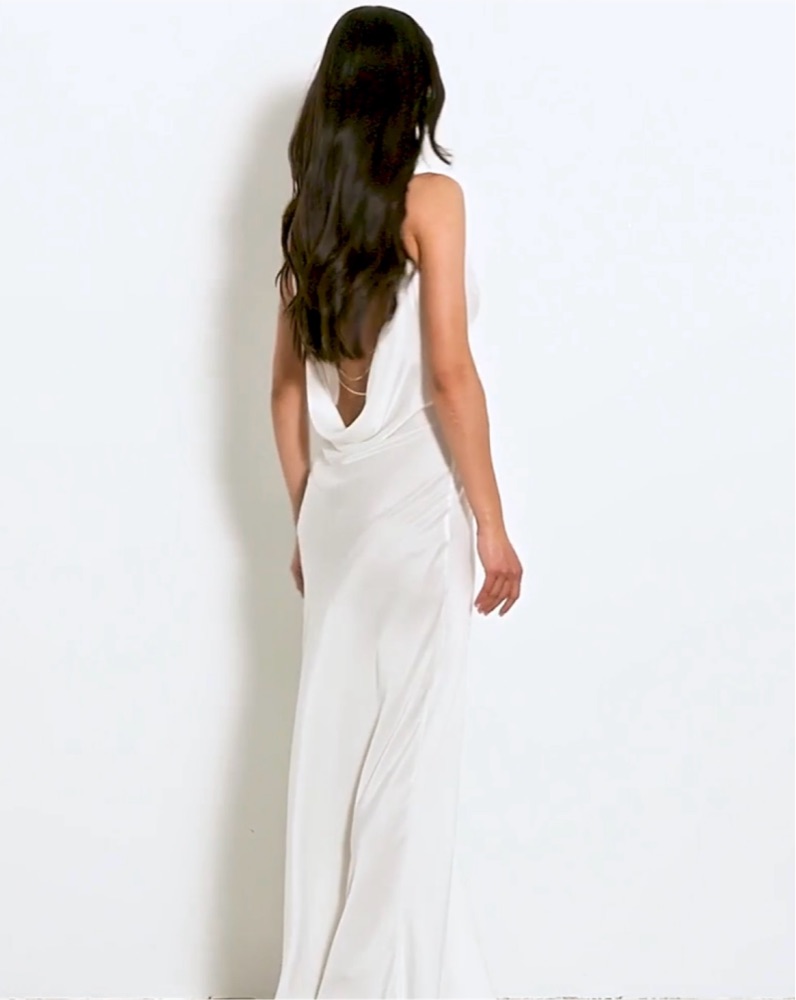 This stunning white maxi dress is perfect for any formal or special occasion. The draped silhouette and open back create an elegant and sophisticated look. Gold chain detail. New with tags
