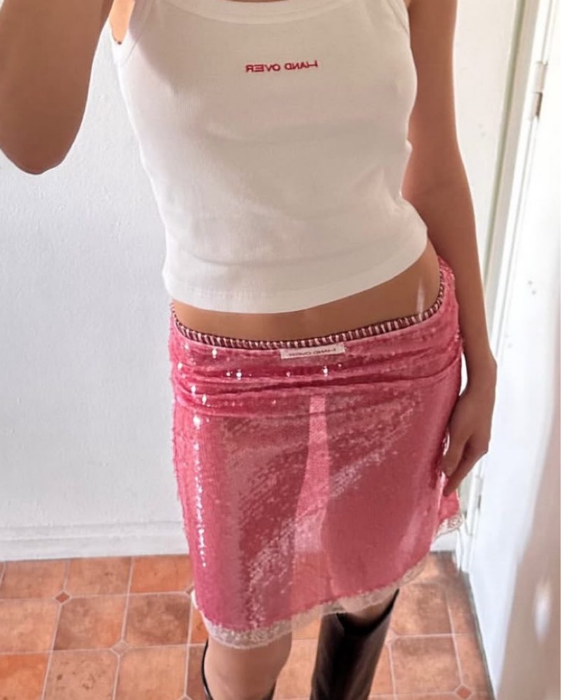 The perfect summer skirt. Sheer, pink sequins, lace detail - looks amazing on! 💞