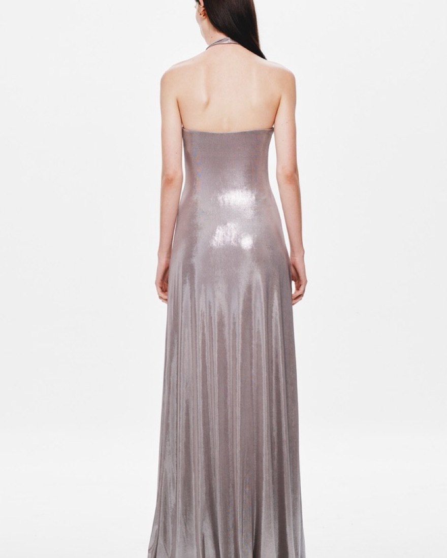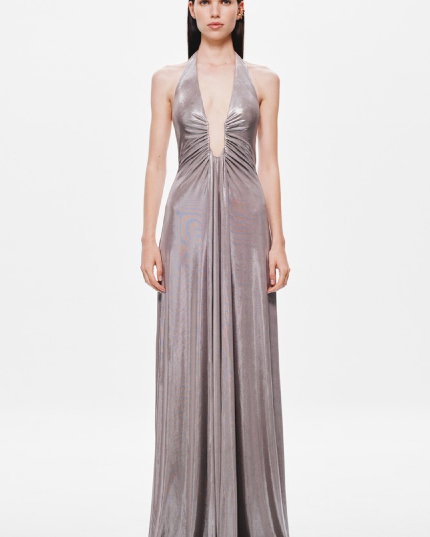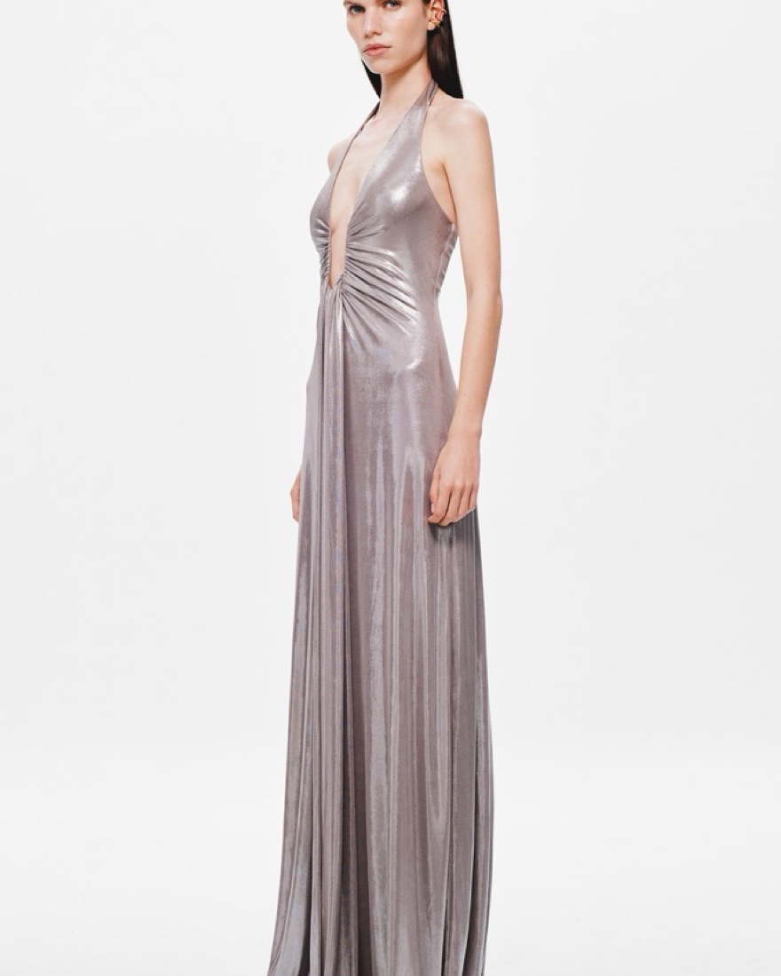The ‘Jennifer’ Foil Jersey Maxi Dress by MISHA is a statement piece that exudes elegance and allure. Crafted in a shimmering Metallic Cinder hue, this dress features a plunging halter neckline with an adjustable wire for a custom fit and eye-catching waterfall sash detailing. Designed to hug the fem