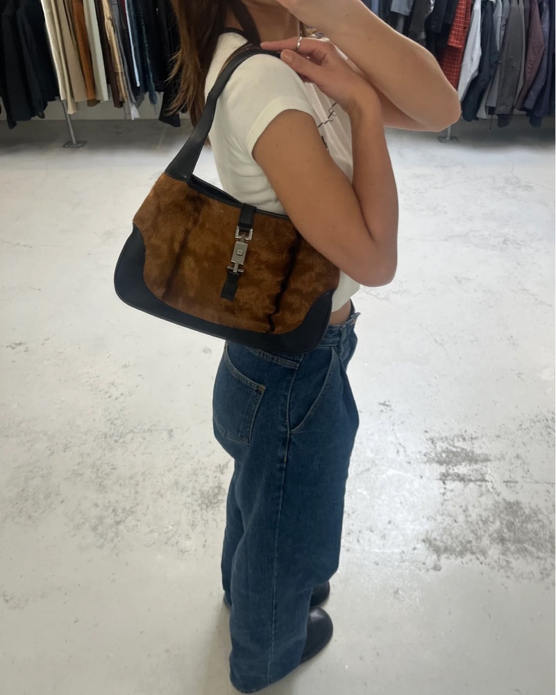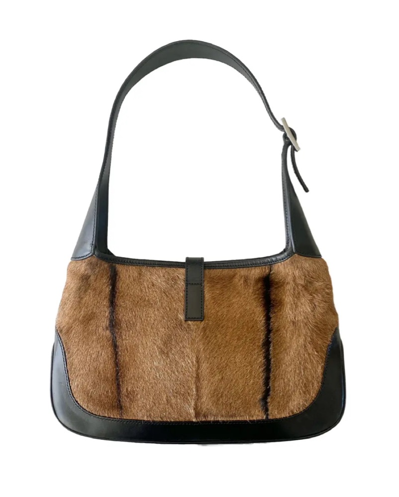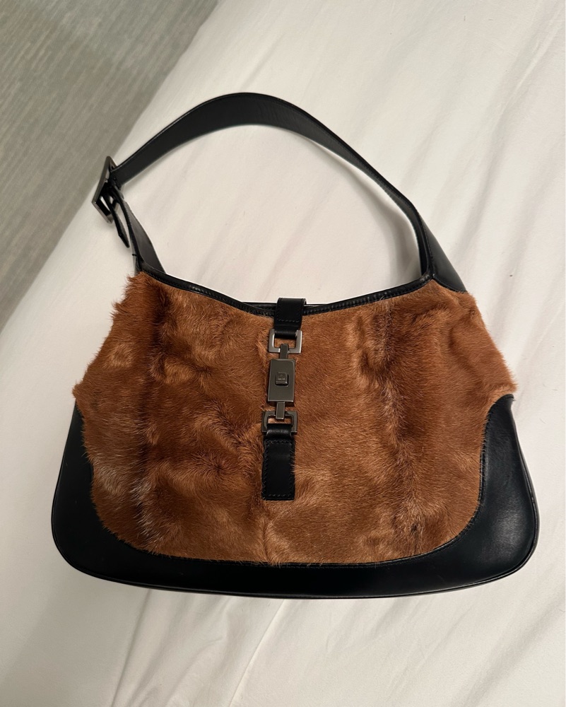 Renting my Vintage Gucci Ponyhair Jackie Bag cutest ponyhair bag for fall - black bag and brown bag This chic brown handbag is perfect for any occasion, from a night out to a casual daytime look.