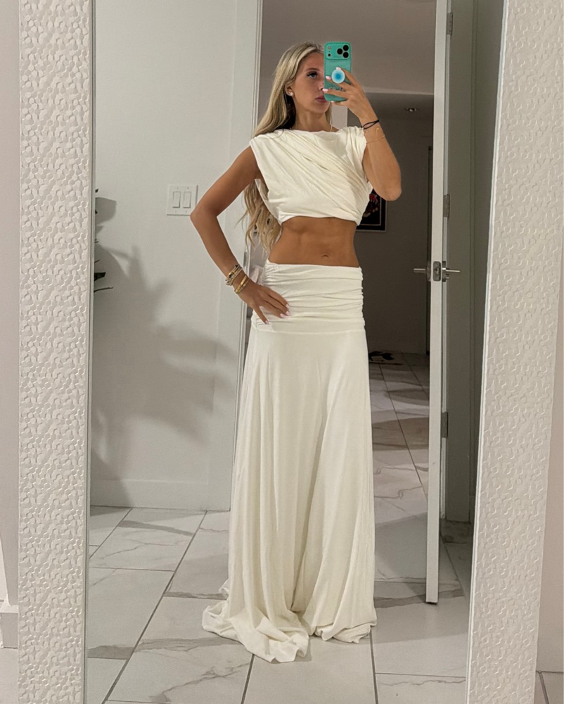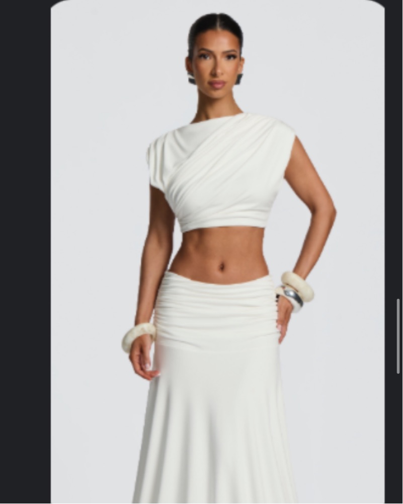 This stunning white maxi dress is perfect for a formal event or special occasion. The draped, one-shoulder design and floor-length skirt create a sophisticated and glamorous look.