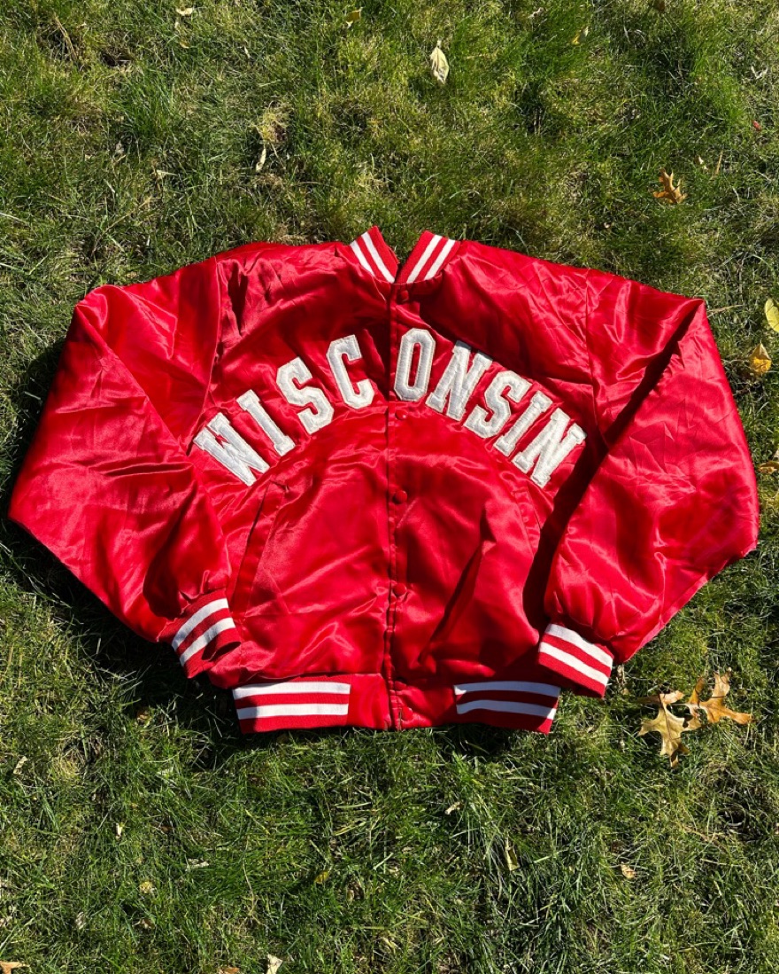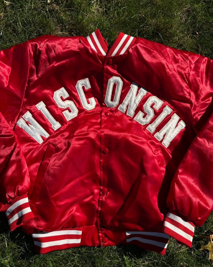 University of Wisconsin vintage red satin bomber jacket, sourced by Tailgate Teens on Instagram. Whether you’re getting ready for an upcoming tailgate or looking to elevate your street style with a sick vintage piece, this is the perfect for you. Jump Around!!!