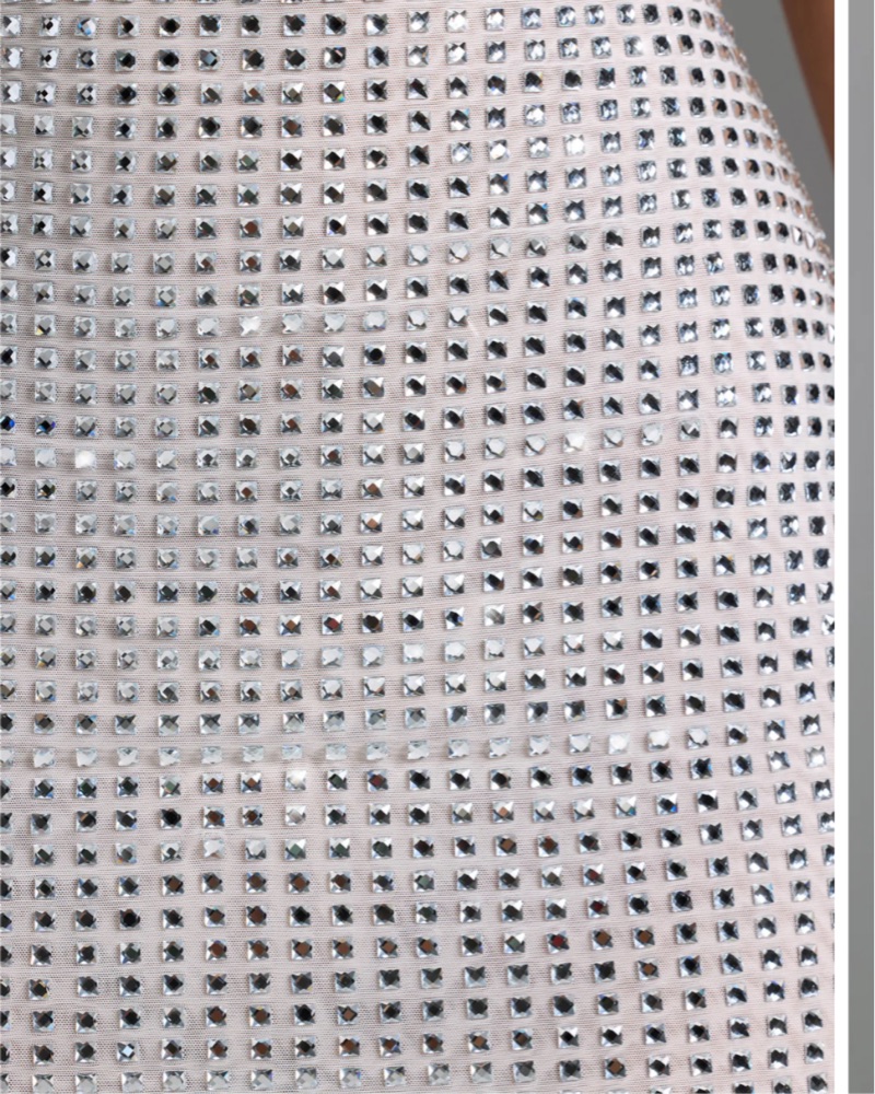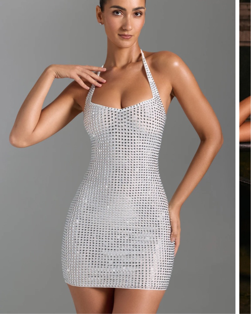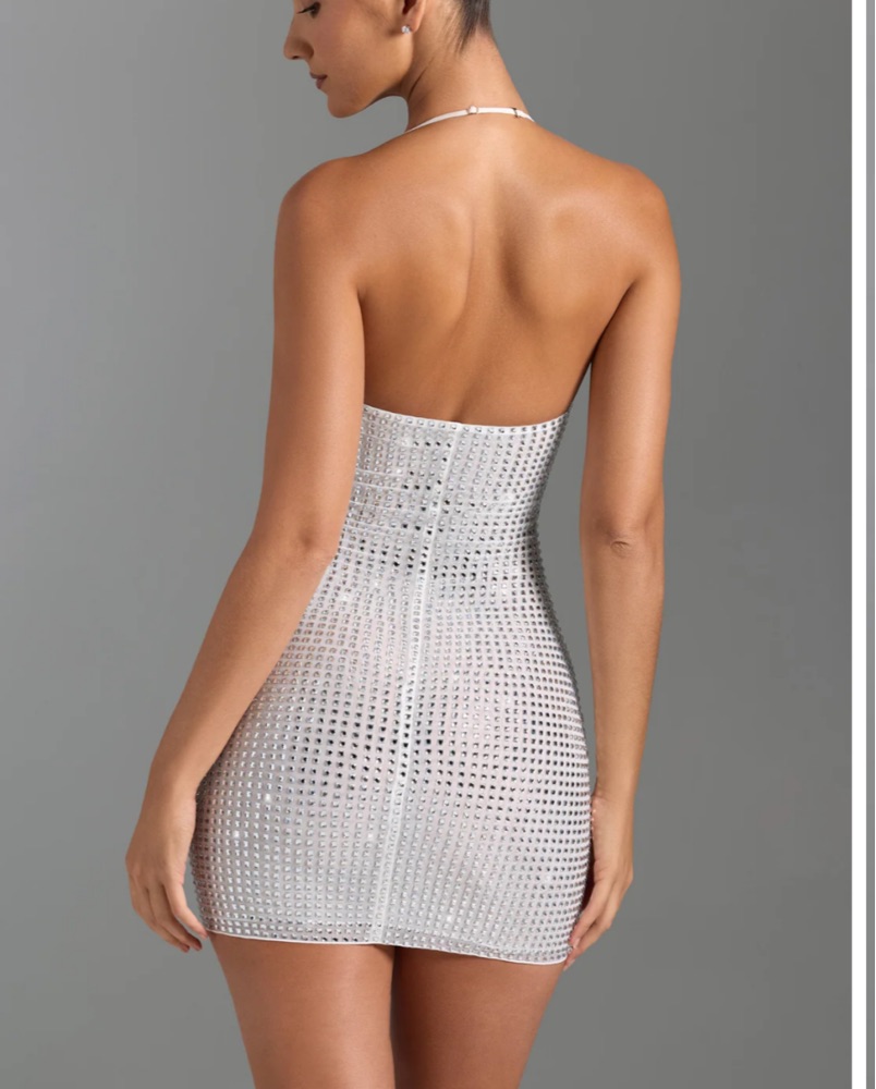 This eye-catching rhinestone mini dress is perfect for a night out on the town. The sparkling embellishments and figure-hugging silhouette create a truly glamorous look. Tags still on. Perfect for bachelorette!