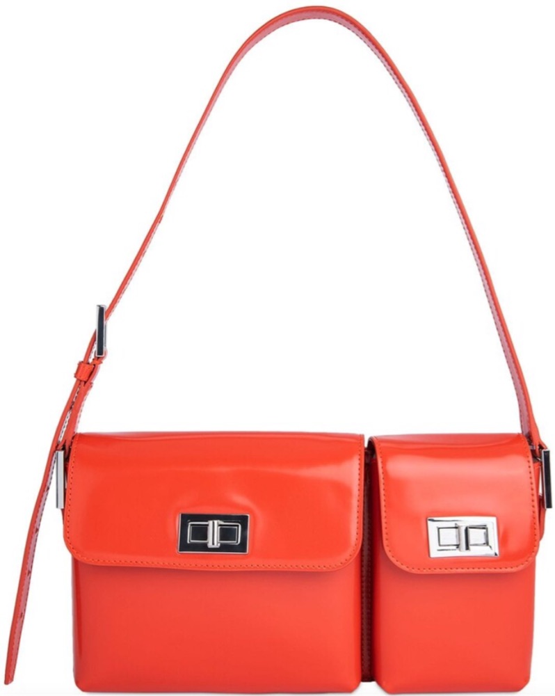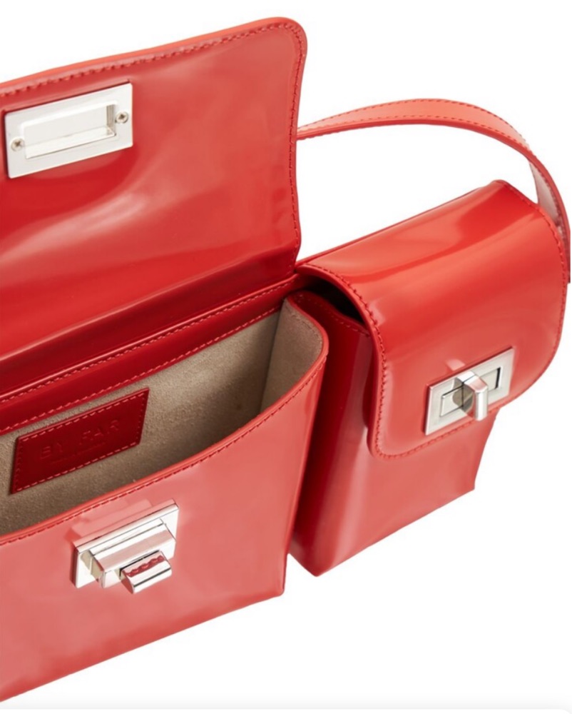 Semi patent leather bag with adjustable strap and two separate sections. Super cute for going out, dressing up, or anything else.