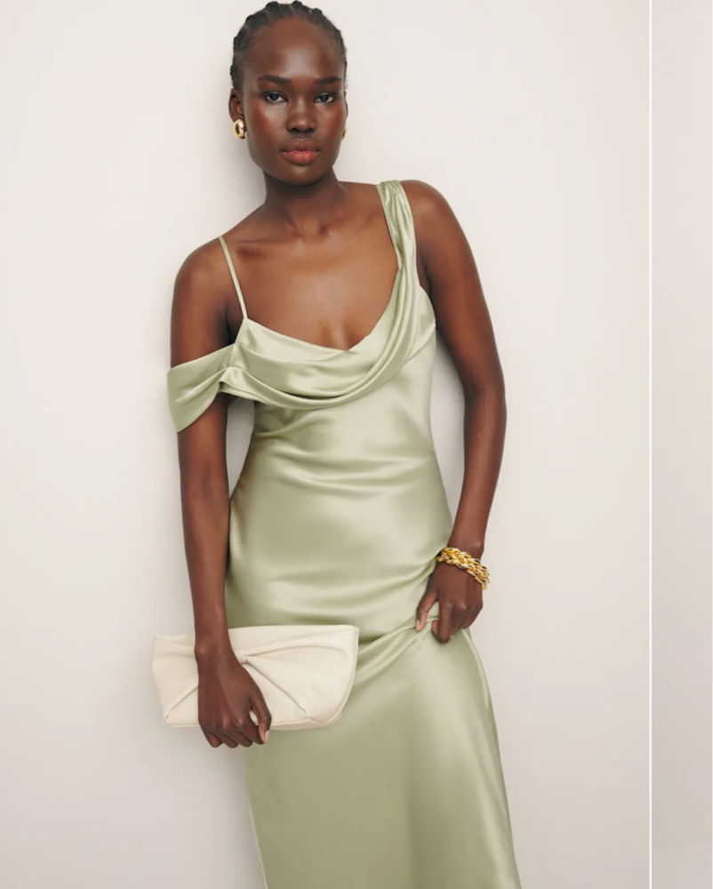 Beautiful light green/sage color! Off the shoulder, very cute. True to size! Fee not really negotiable because the silk stains so easily, I have to take dry cleaning into consideration