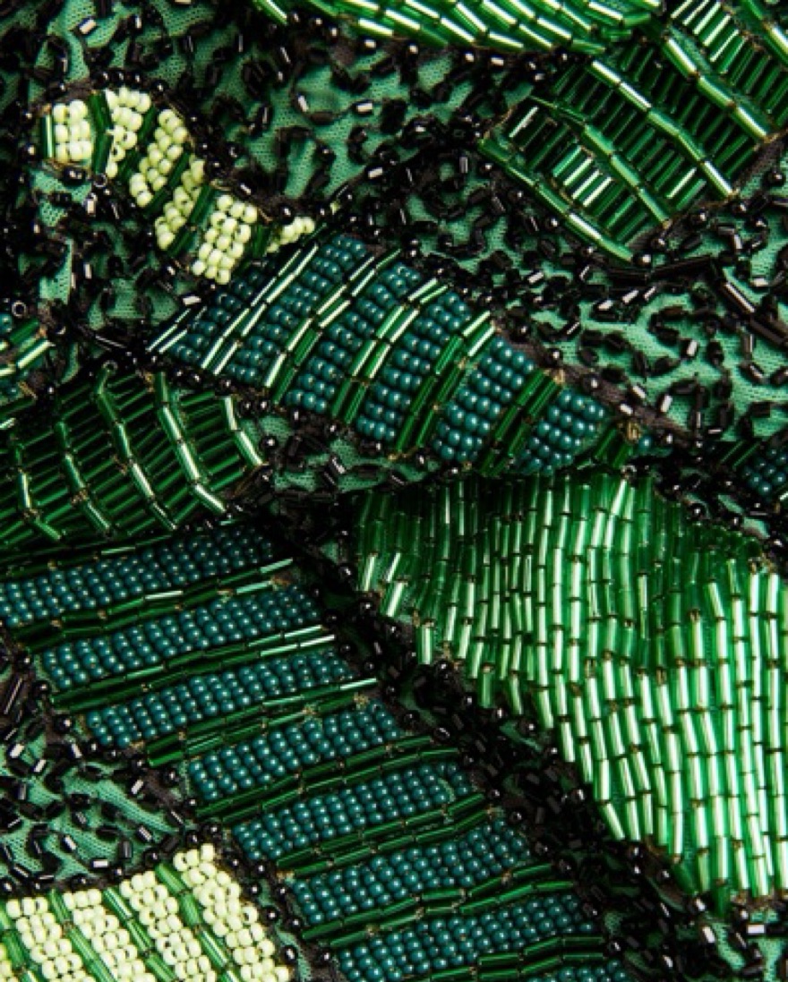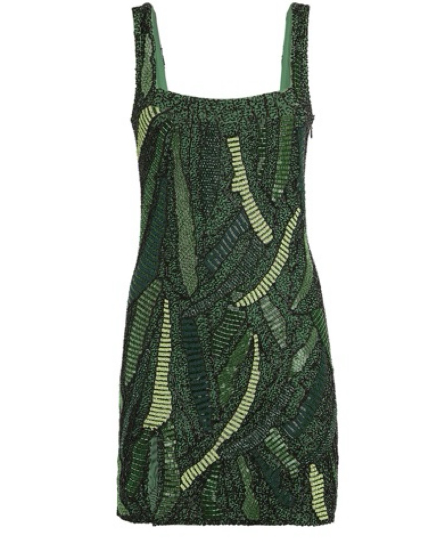 Our best-selling hand-beaded mini dress has been updated. This style is fully beaded in a green and leafy motif and features a side slit and hidden zipper at the back. Sold out online.