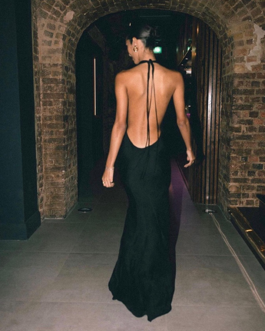 This stunning black halter neck gown is perfect for a formal event or special occasion. The sleek, form-fitting silhouette and open back create a sophisticated and alluring look. Ill include some boob tape as its very showy and sexy. Very long !