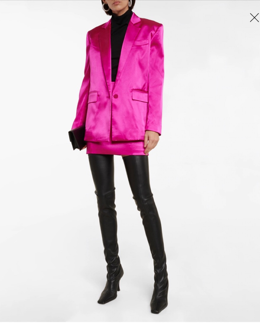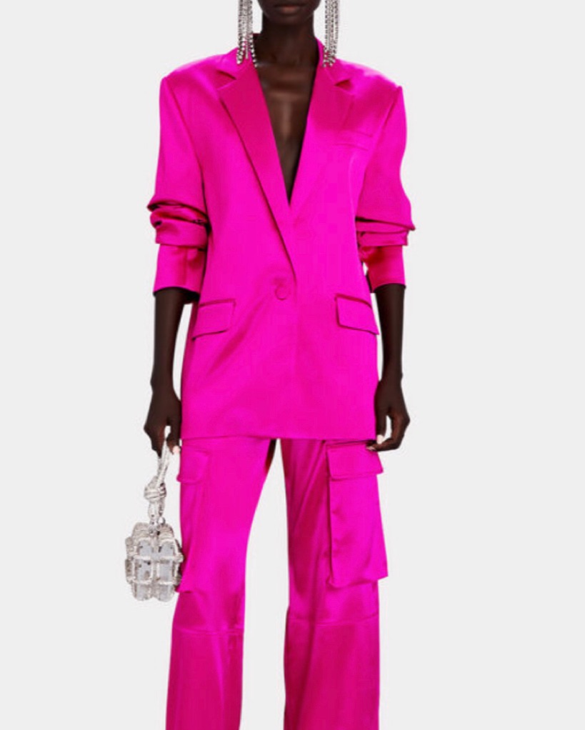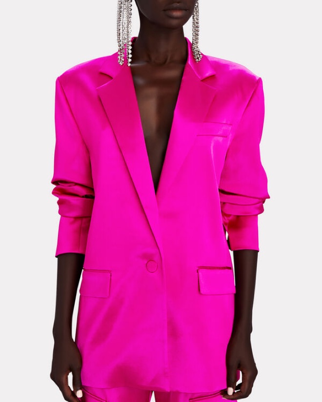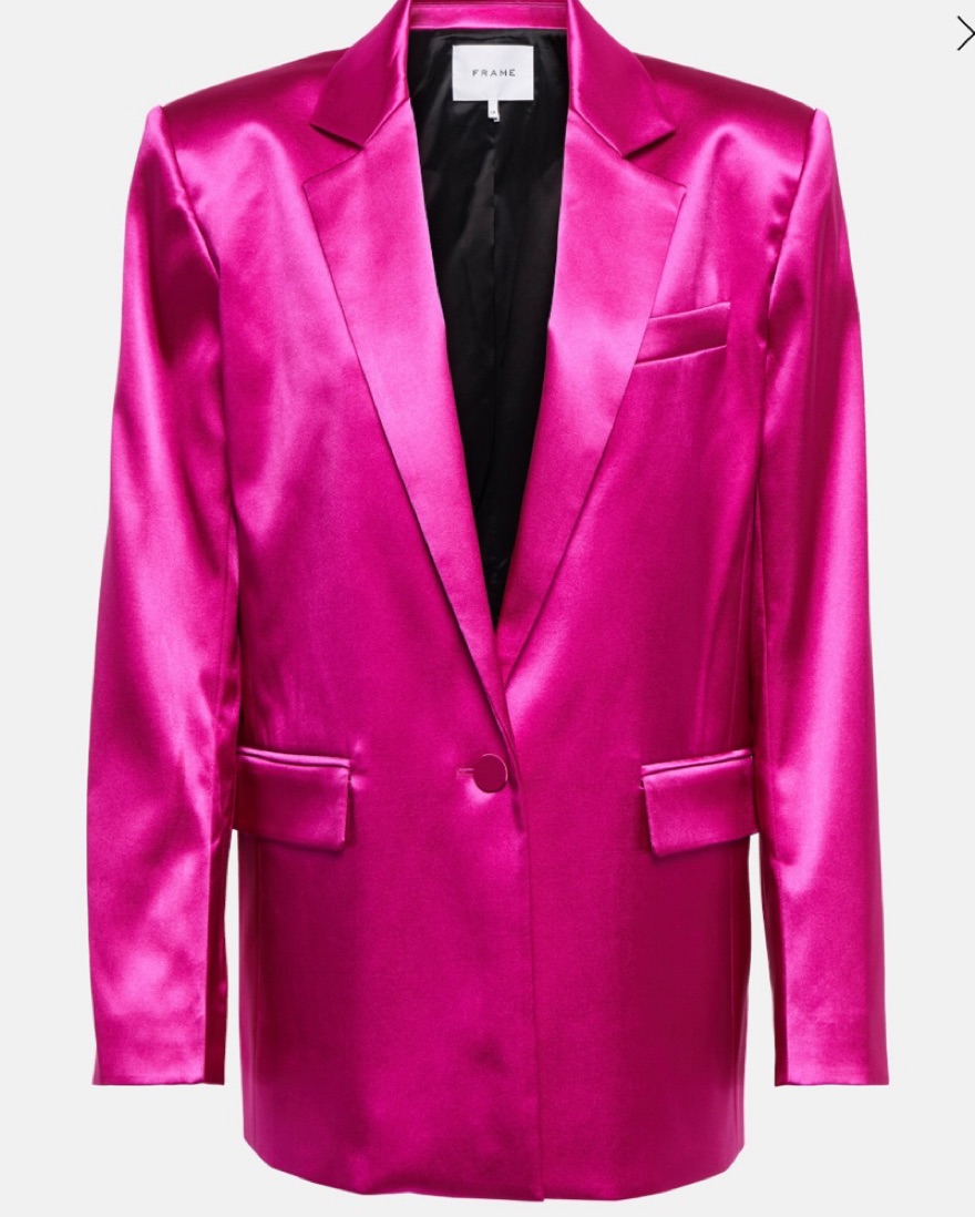This blazer from Frame packs a sartorial punch. Made from lustrous satin, this single-breasted design has an oversized cut, notched lapels, and flap pockets. Frame's Strong Shoulder blazer is crafted of soft satin. This classic layering piece is styled with flap pockets and a single-button closure.