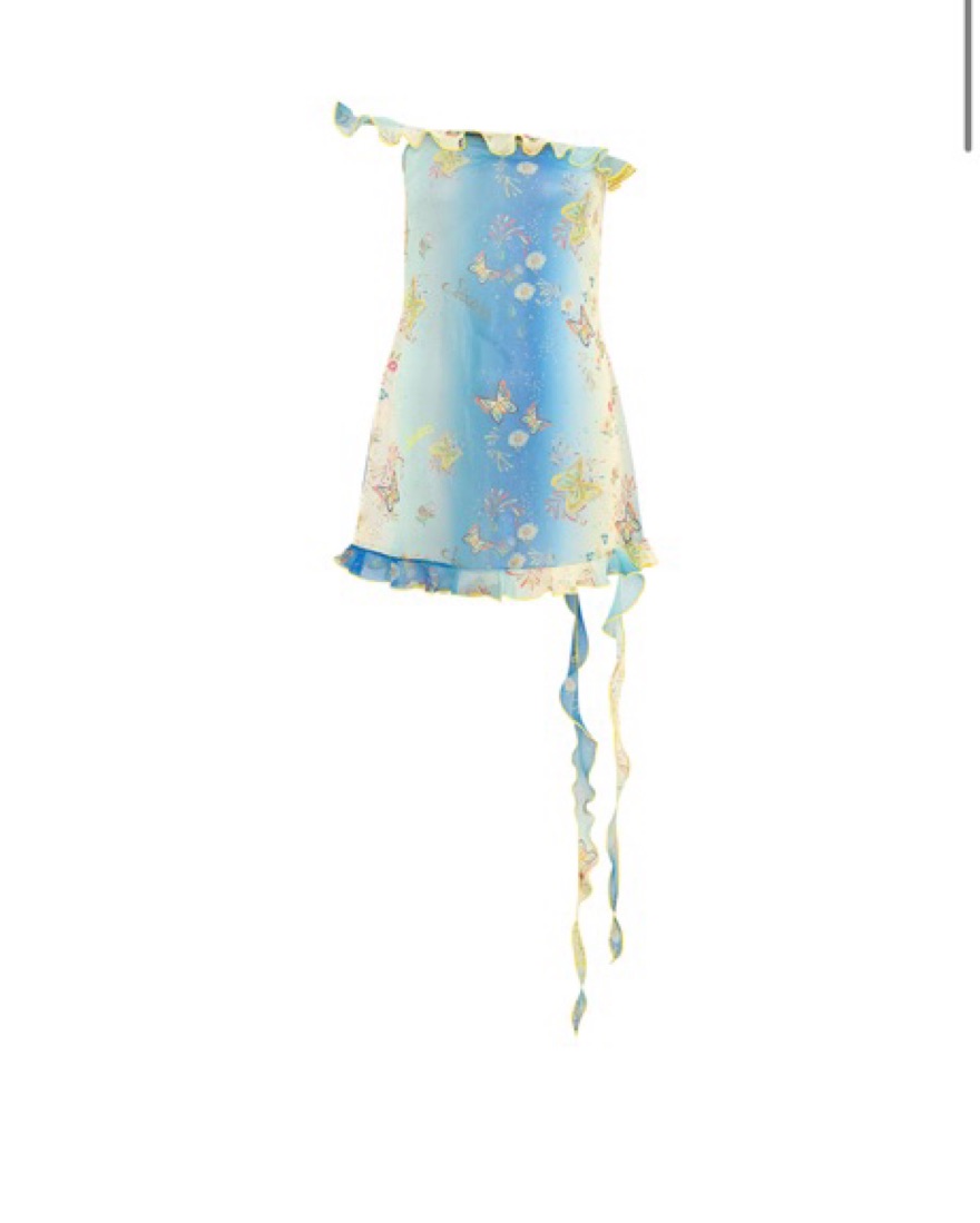 Kyla mini dress in blue butterfly print! Soze 36, fits a 2 comfortably. Very delicate material please be careful with her!