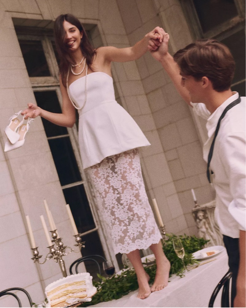 The Delfi Collective Amaya Dress features a structured strapless bodice paired with a romantic lace underskirt.