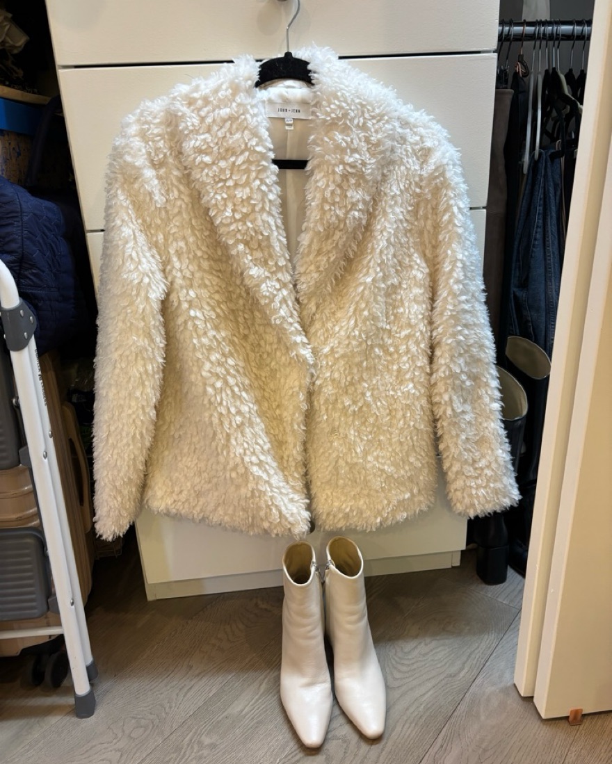 White Sherpa jacket size xs, runs a little large (if you are normally a small or medium this will fit)