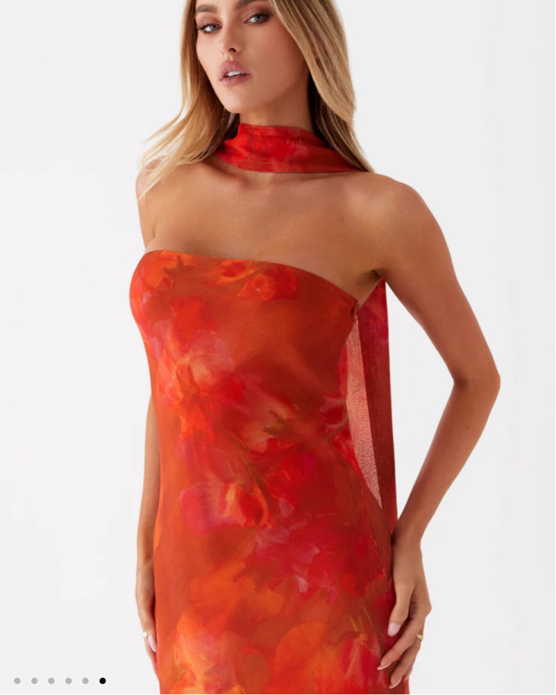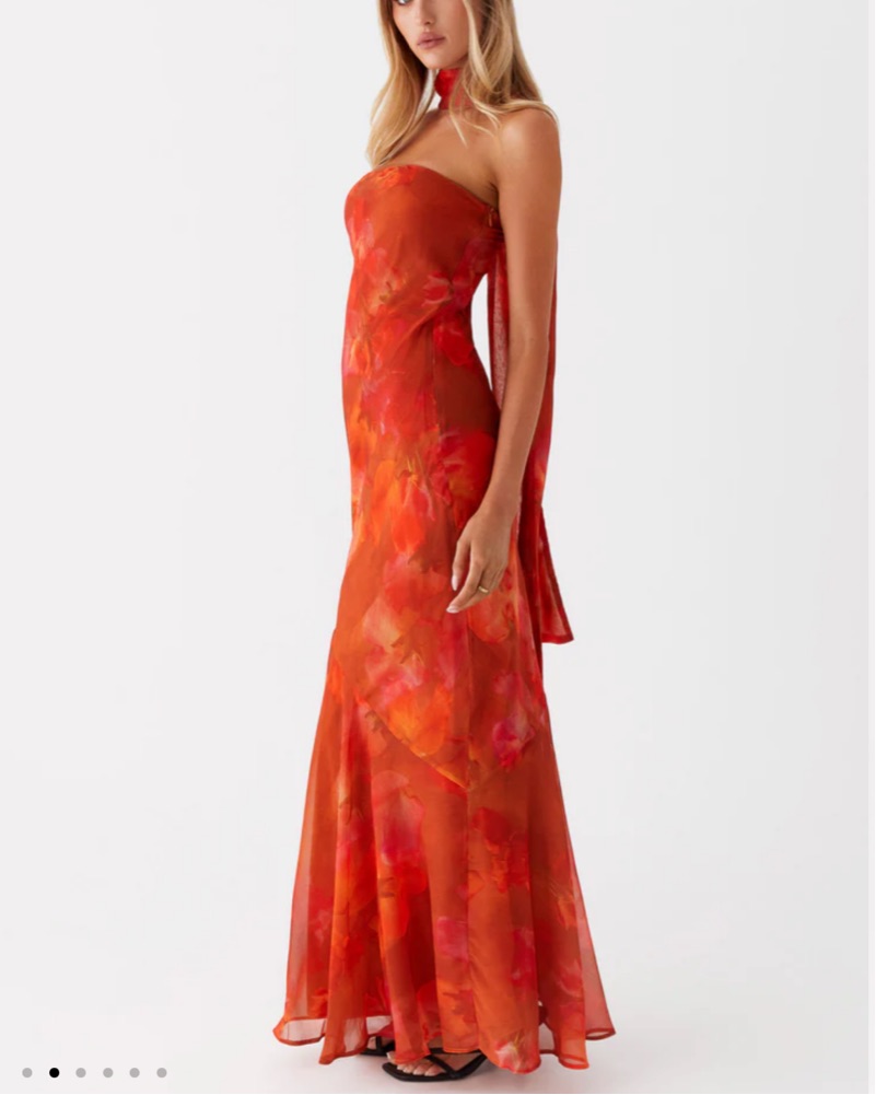 This bold and beautiful maxi dress is perfect for a summer event or special occasion. The vivid floral print and flowing silhouette create a striking and feminine look.