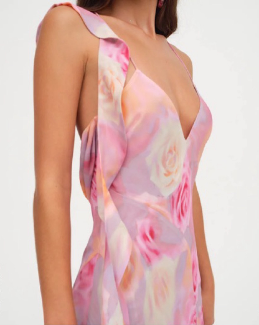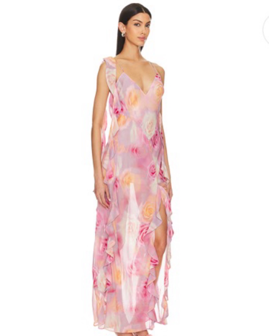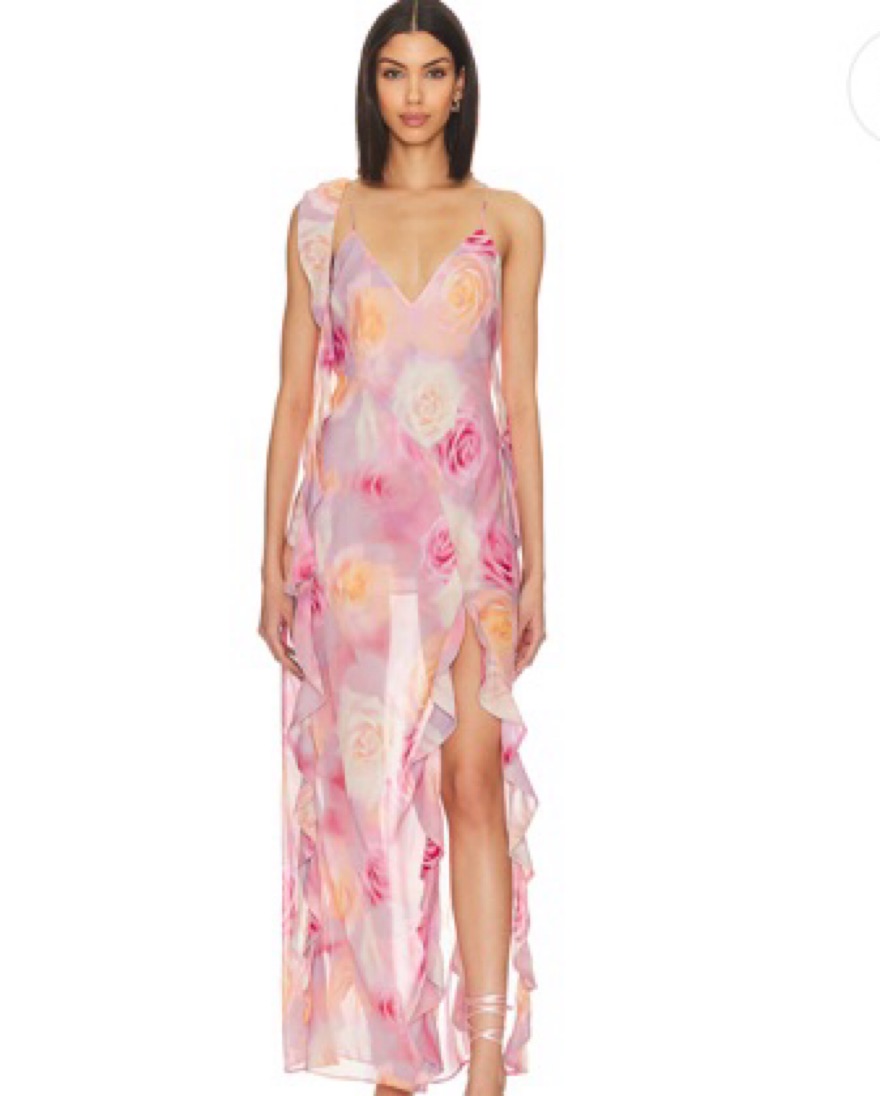 Fun, flirty, and floral—this pink asymmetrical dress features a dreamy rose print and romantic cascading ruffles. The perfect galentines outfit, this floral maxi dress has a removable ruffle at the shoulder and a thigh-high slit for a night of dancing.