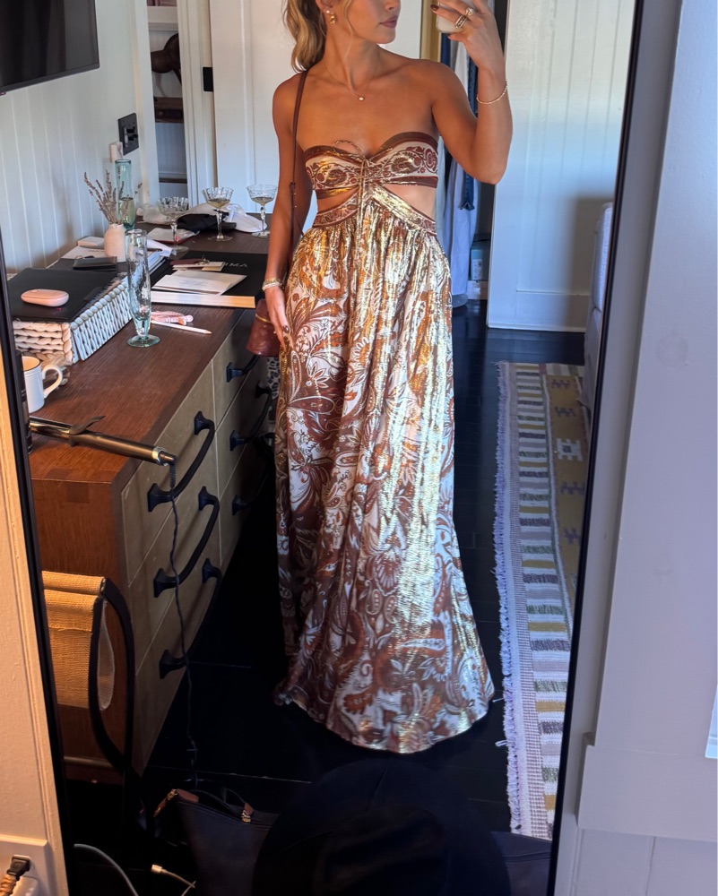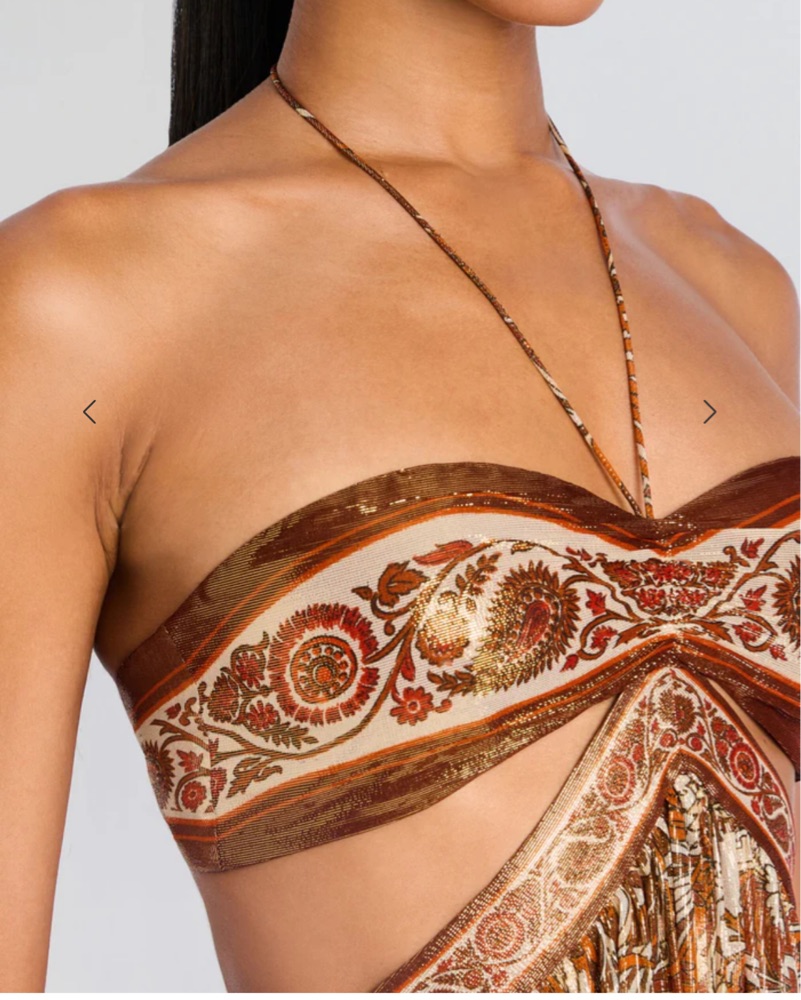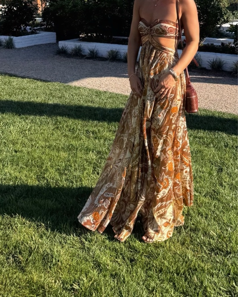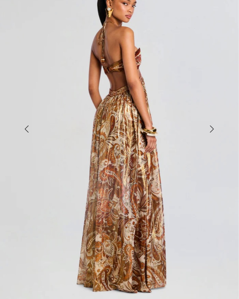 Brand new, never worn, tags on. chiffon gown with a halter neckline that frames the shoulders. Its open back and side cutouts create a stylish silhouette, while the paisley print adds a modern bohemian touch. Finished with a hidden back zipper and hook-and-eye closure,