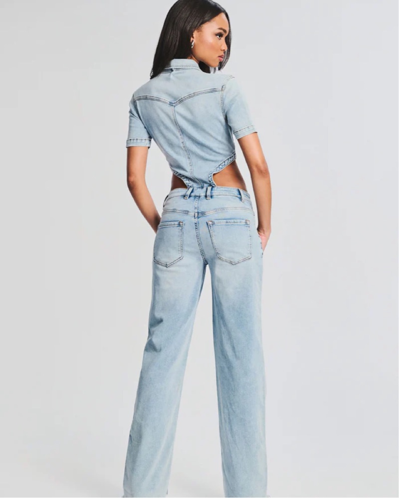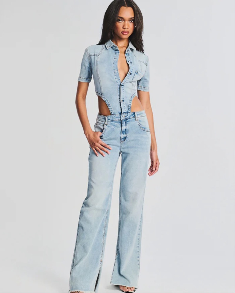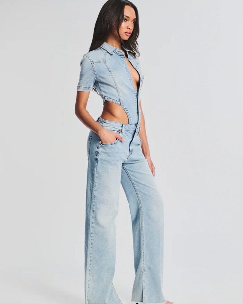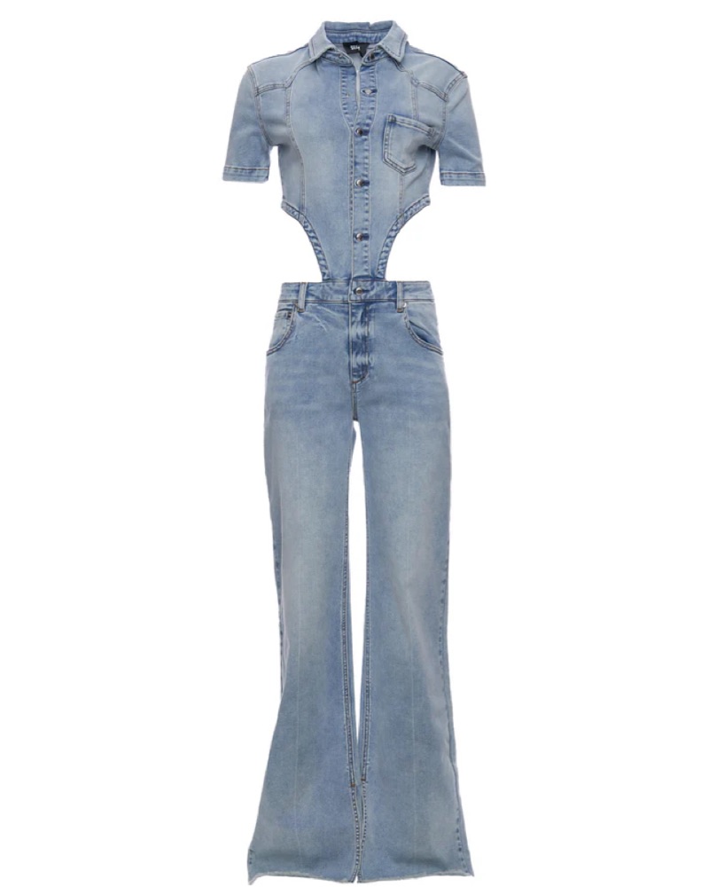 Mid-sleeved denim button-up jumpsuit with a single front pocket and lower bodice cutouts. Wide-leg pants with lightly distressed hem. Jumpsuit is quite long, may need to wear with heels so hem doesn’t drag.