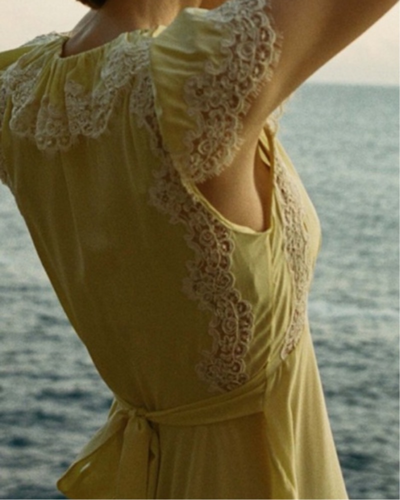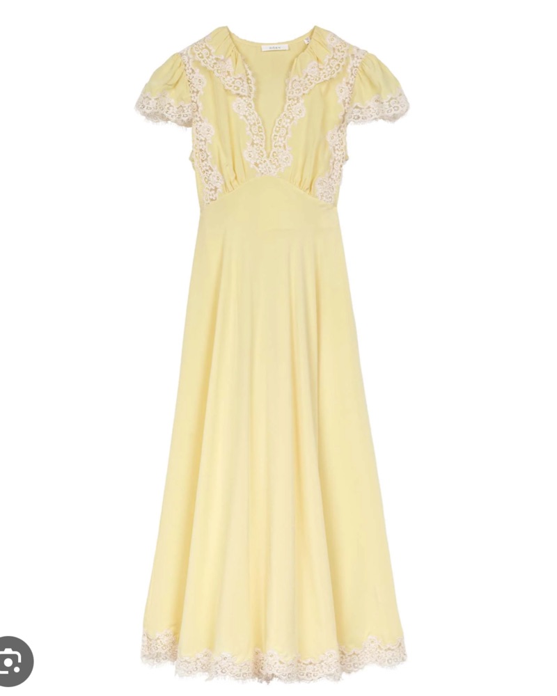 Yellow dress with ivory lace trim. Toe back waist detail super flattering on. Semi sheer. I’d wear a slip! Size Xs