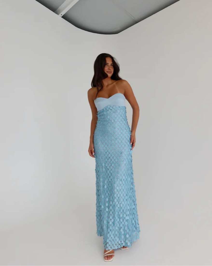 We suggest choosing a size up if you're between sizes Strapless silhouette Maxi length Crepe satin bodice A-line silhouette Centre back zip
