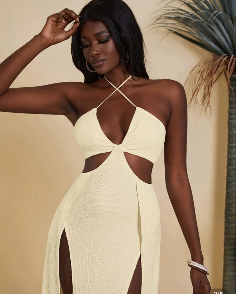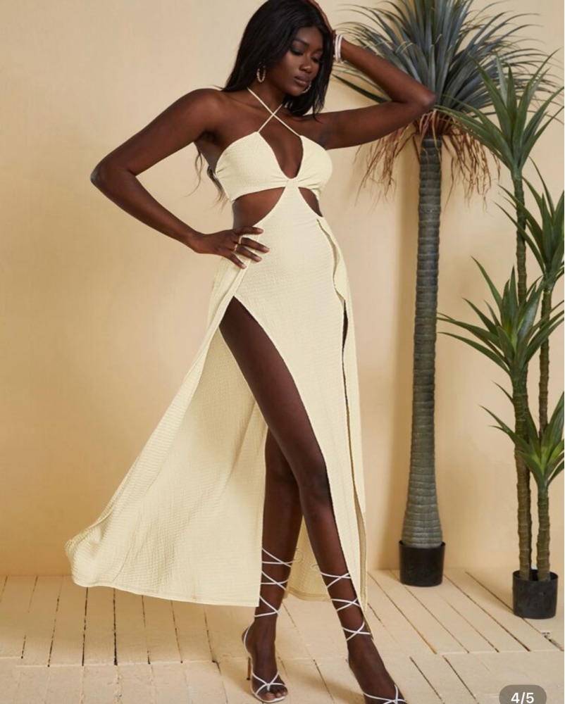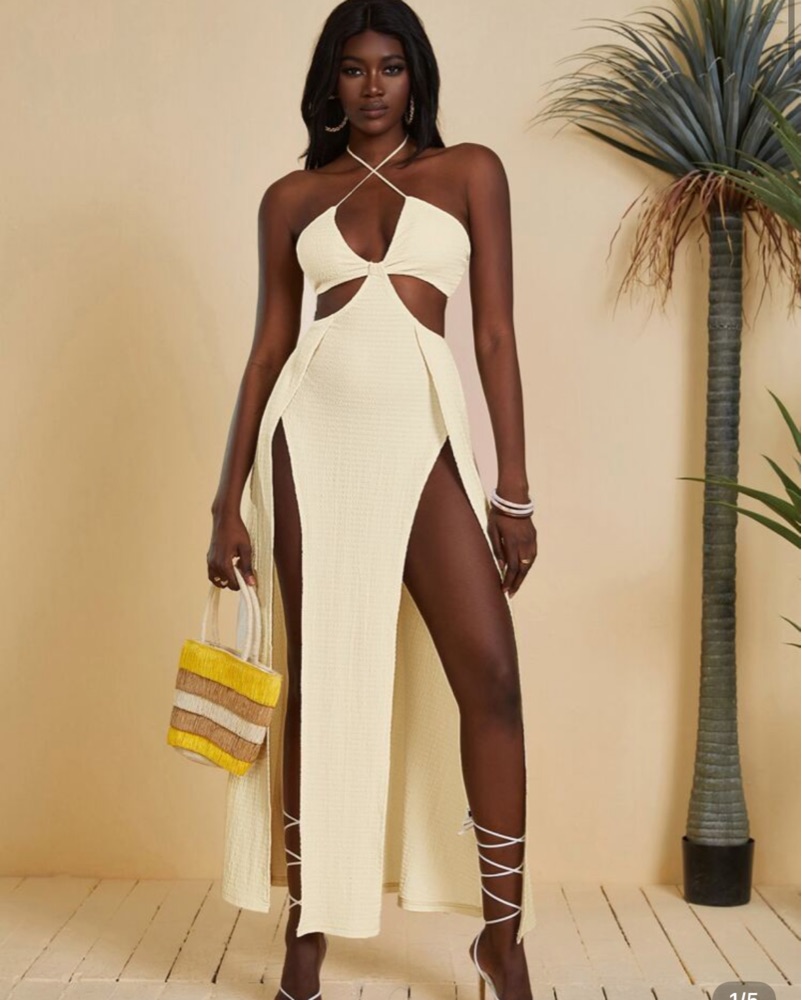 This captivating white maxi dress is perfect for a glamorous event or special occasion. The eye-catching cutout detail and thigh-high slit create a bold, alluring look.
