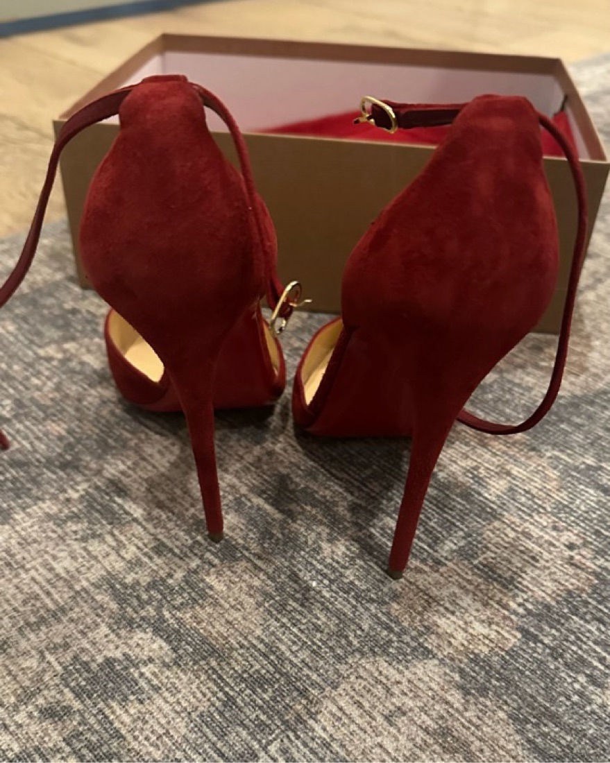 dark red velvety material and adjustable ankle strap!