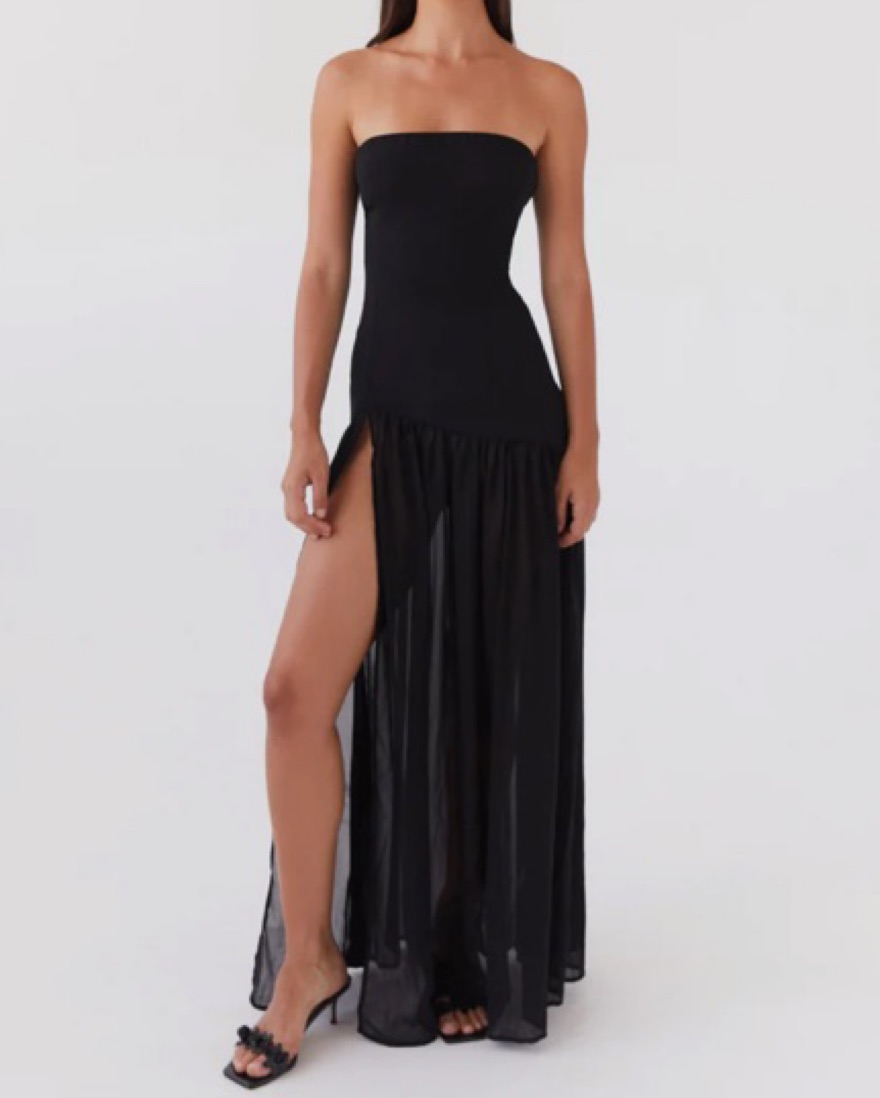 Stunning strapless black gown gives a beautiful silhouette with its drop waist/side slit skirt. Brand new with tags.