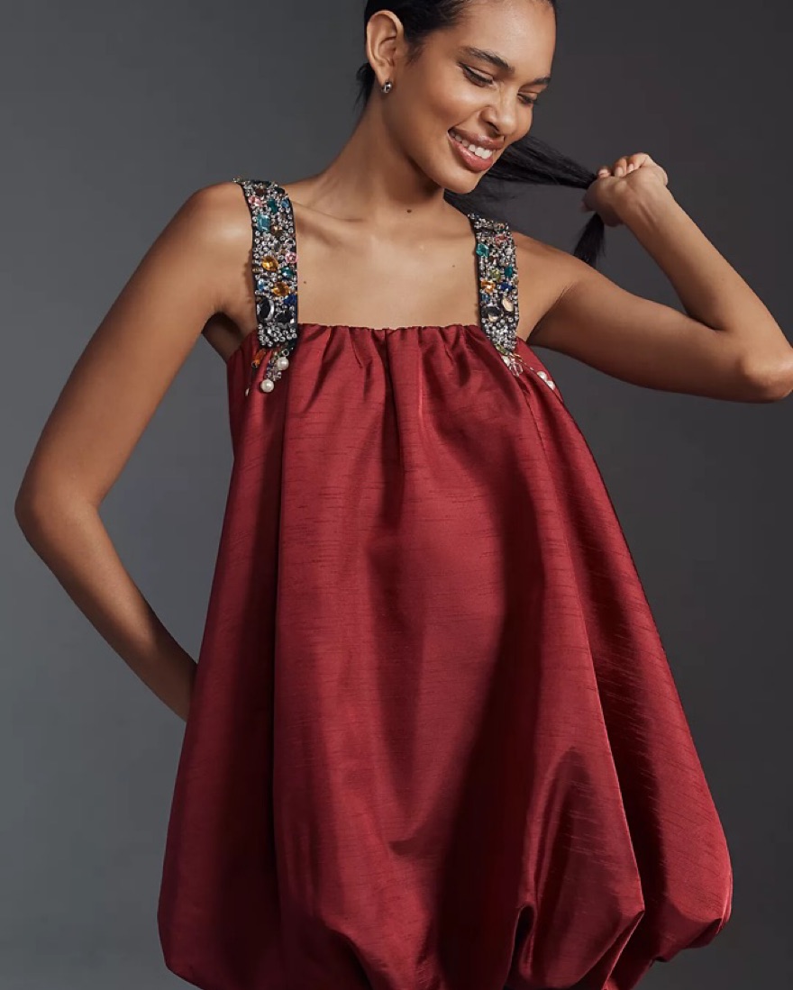 This stunning ruby red cocktail dress is perfect for a night out on the town. The eye-catching beaded shoulder straps add a touch of glamour.