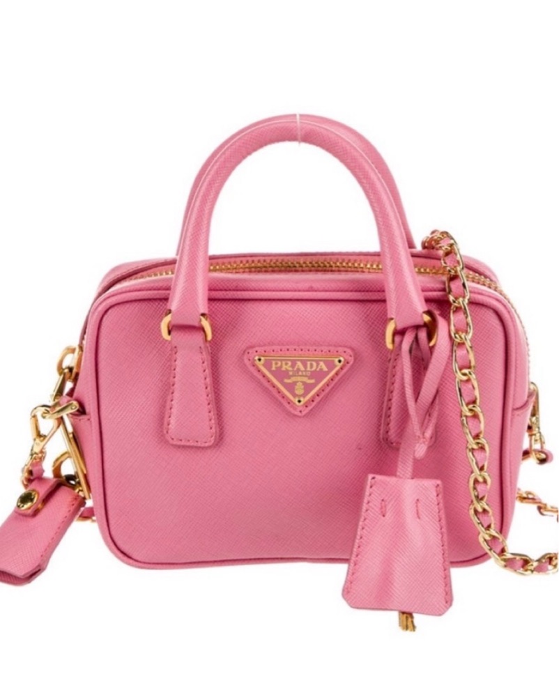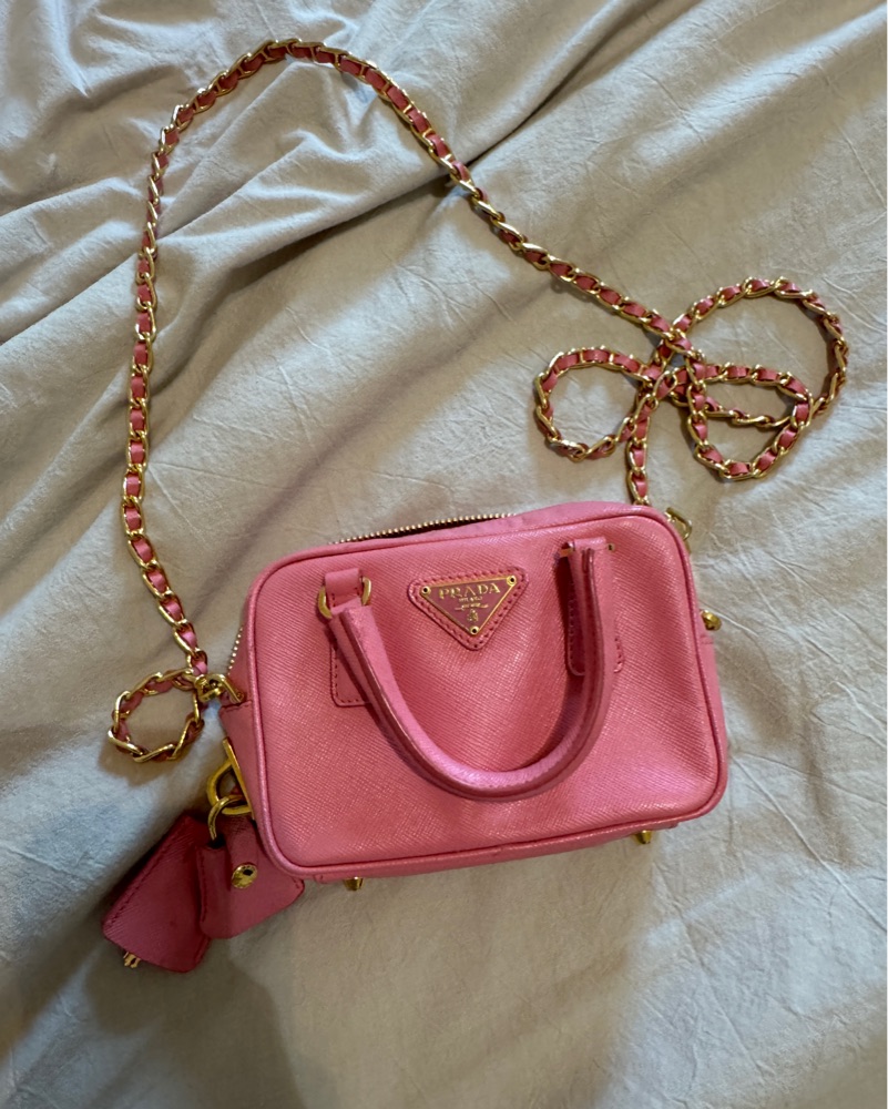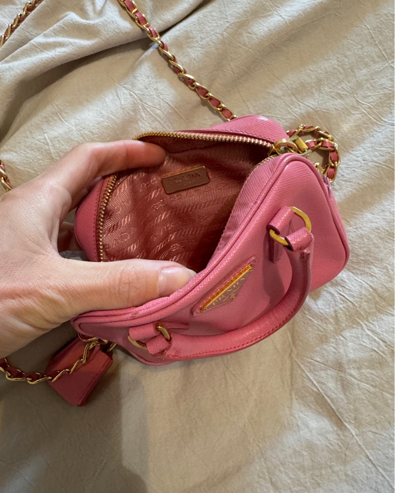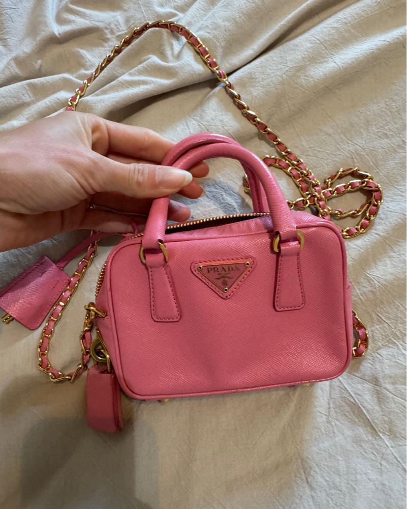 Prada pink Saffiano leather mini bag with chain. She’s tiny but mighty.